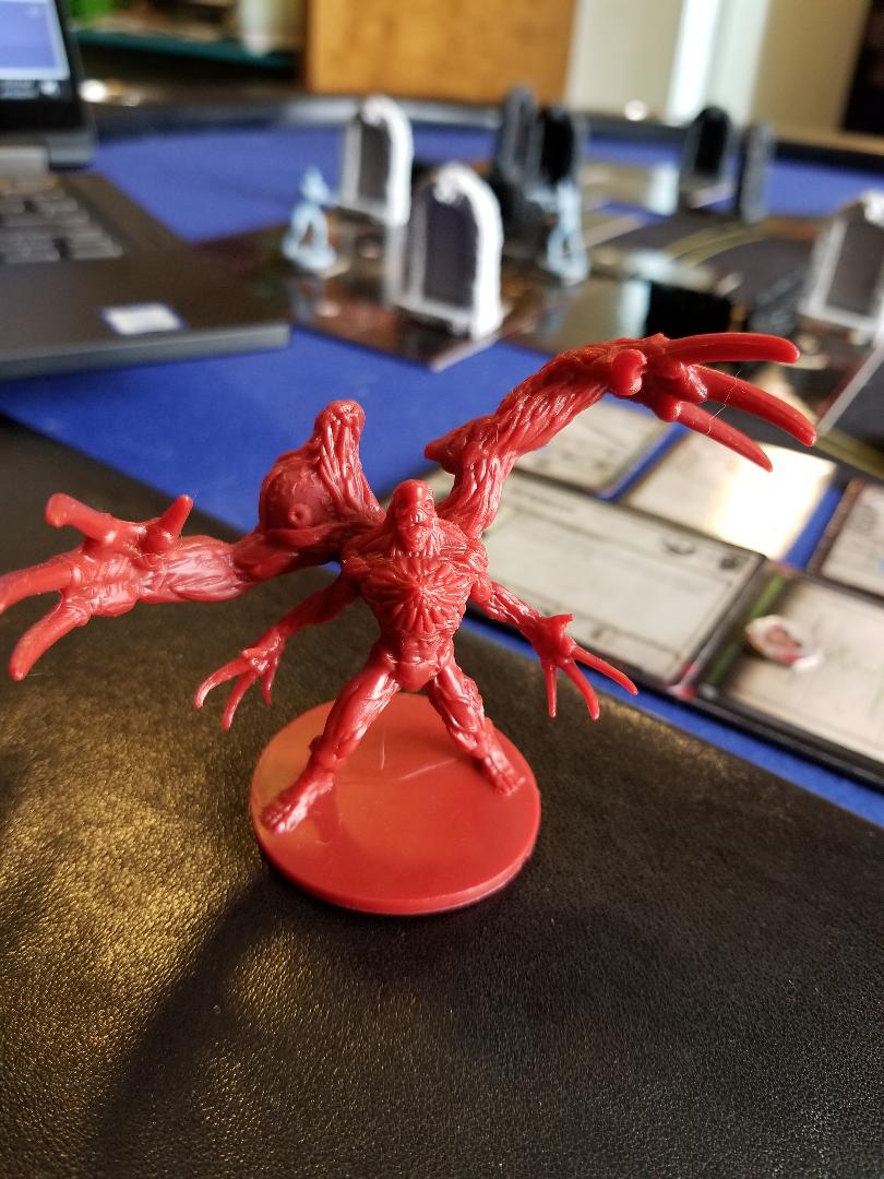 Let’s see what’s next…..AH! The minis. The minis are…..actually not bad. They are not top of the line minis by any means but they are pretty good. The zombie sculpts are pretty cool and actually remind me of zombies with their poses regardless of their detail, which isn’t terrible. The 4 main characters you can play as all look different and are colored differently to differentiate them from the enemies which is always welcome. The lickers and zombie dogs are all good looking with different sculpts for each. The bosses are really the stand outs here though. The G monster is really cool looking but man that Birken monster is just spectacular. The thing is really big and really adds a ton to the theme and aggressive nature of the game.