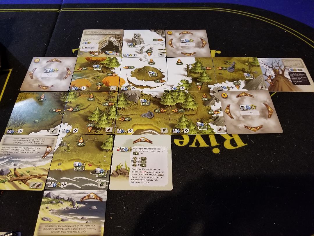 The components are really nice with the most of them consisting of the card tiles you will be laying out as you explore the land. There are some small dice to track your number of uses of items and the like as well which are pretty standard mini dice. There are also a few minis of the characters you can play as and my personal fav, the tiny mini campfire. I love that thing. I do kinda wish the land tiles/cards were a bit thicker but there are SO MANY of them I can for sure see why they are not. There is this discard holder thing that is a neat idea but you have to disassemble it every time you put it up for storage and already it’s getting a little frayed around the edges after just a handful of assemblies. I still use it but I can see it not lasting that long.