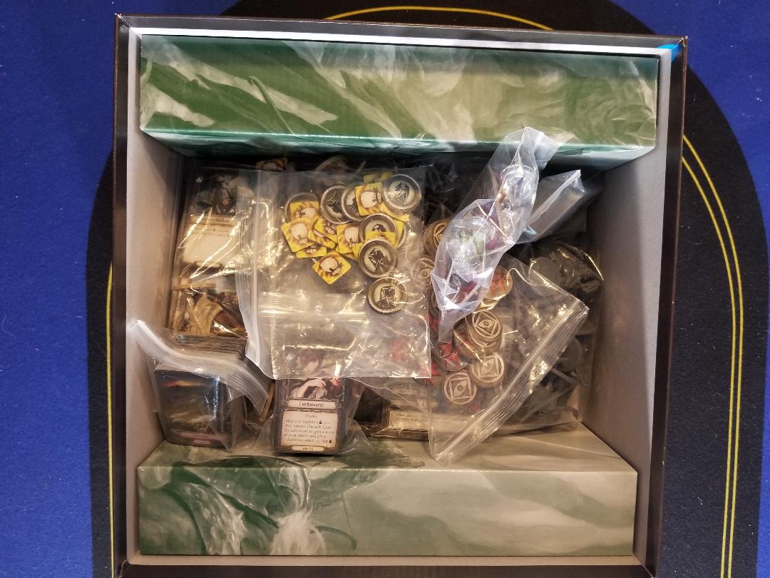 The box is decently large but can still fit in a standard Kallax shelf. It also has the standard Fantasy Flight cardboard insert so you will want to bag everything. This particular insert doesn’t really work at all for this game since most of the components are the oddly shaped board tiles. You WILL have a ton of extra space in this box however if you remove the insert and you will want to find some plastic baggies to separate and store all the different tokens and minis. Not impressed at all with Fantasy Flight’s inserts or storage solutions and in my opinion this is the main thing they as a company needs to work on with their games.