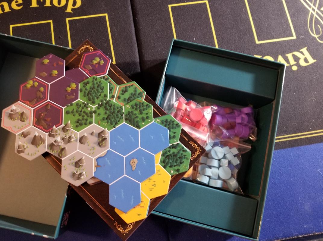 The box is on the smaller side and everything fits in perfectly snug so there really isn’t any room for movement. The insert is just a small cardboard piece that is mainly there to hold the board pieces above the tokens. You will have to bag up all the tokens individually but they do include 5 small baggies to do this with for each player’s pieces. Of course there are still a few other tokens such as the monument and camp wooden tokens that will need a bag. Kinda strange they didn’t include just one more bag for those. Either way the game is pretty fast to setup, one of those games that I actually enjoy setting up actually. Draw a random card to see what map layout you get and then position the tiles in a specific way. After that set up the camp and monument tokens on specific spaces. Flip the setup card and each player has an exclusive number that corresponds to a particular clue that only they will know that is listed in their clue booklet.