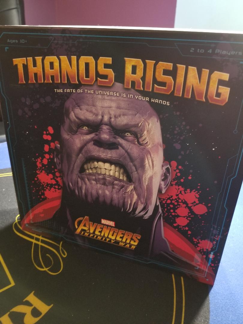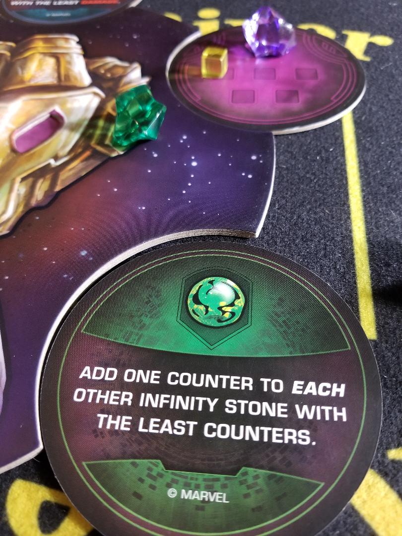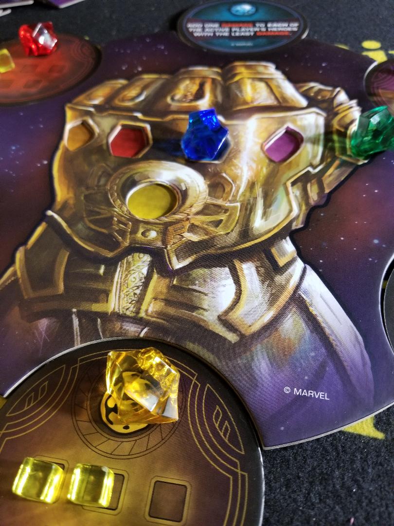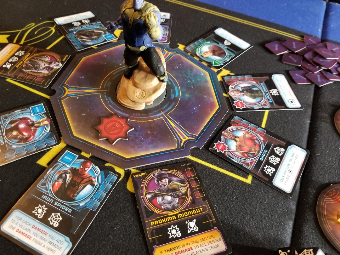 So, the setup isn’t just your typical board game board. You have one hex shaped-ish board that has a picture of the infinity gauntlet with colored spaces for each infinity stone. Along the outside edges of this board sits circular pads with each different infinity stone on top of them. The other board is also hex-ish shaped with a pretty large Thanos plastic mini in the middle. That board is broken into 3 different quadrants with a total of 9 game cards set around the outside edges.