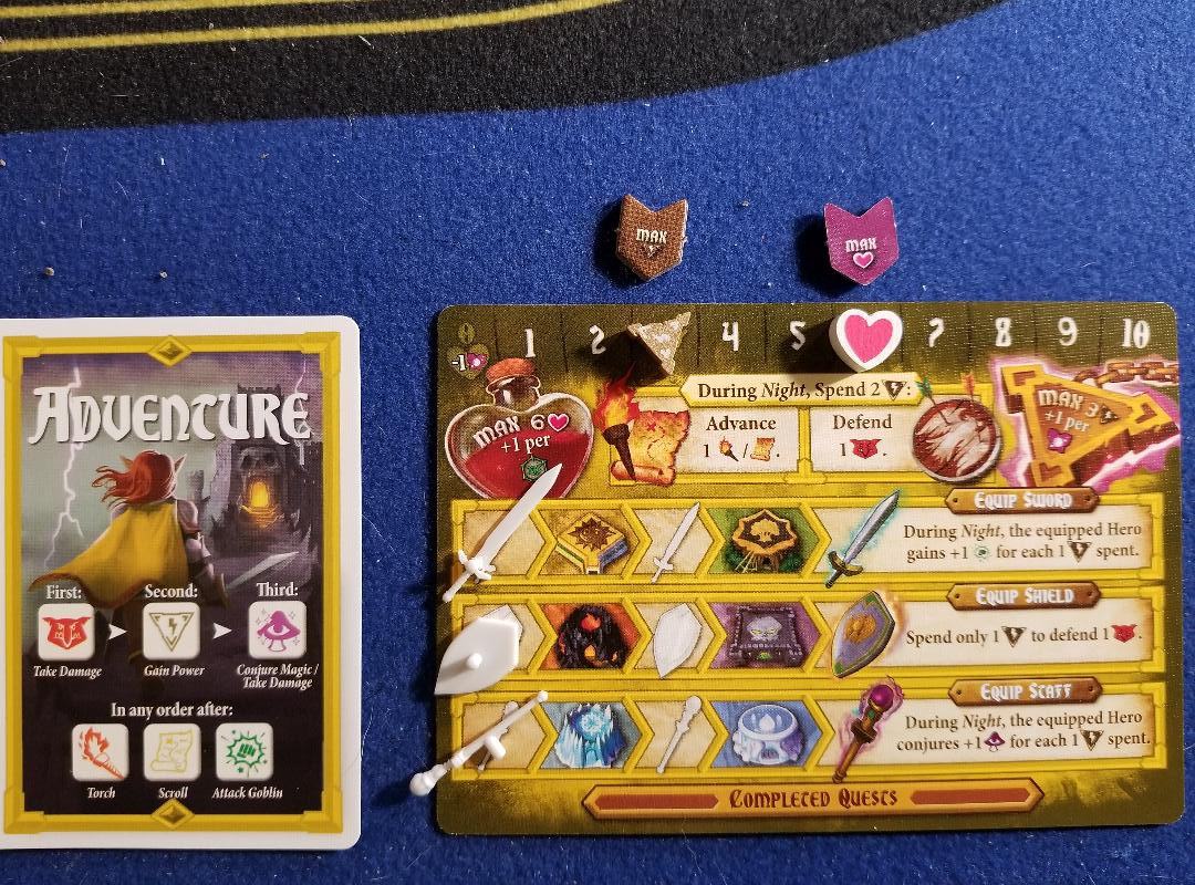 I am super impressed overall with basically everything in this tiny box. The components are clever and very unique. The quest cards are high quality and the map cards that compose the land in which you play on are also high quality. The Meeple are very cool as they have included a bunch of little plastic weapon tokens that actually fit into tiny holes on the hand parts of the meeple so it actually looks like the meeple is holding a sword and shield or a bow and arrow. When those weapons are not attached to the meeples they are hanging out on a makeshift cardboard display stand that looks like something you would see in a blacksmiths shop. It’s really awesome looking.