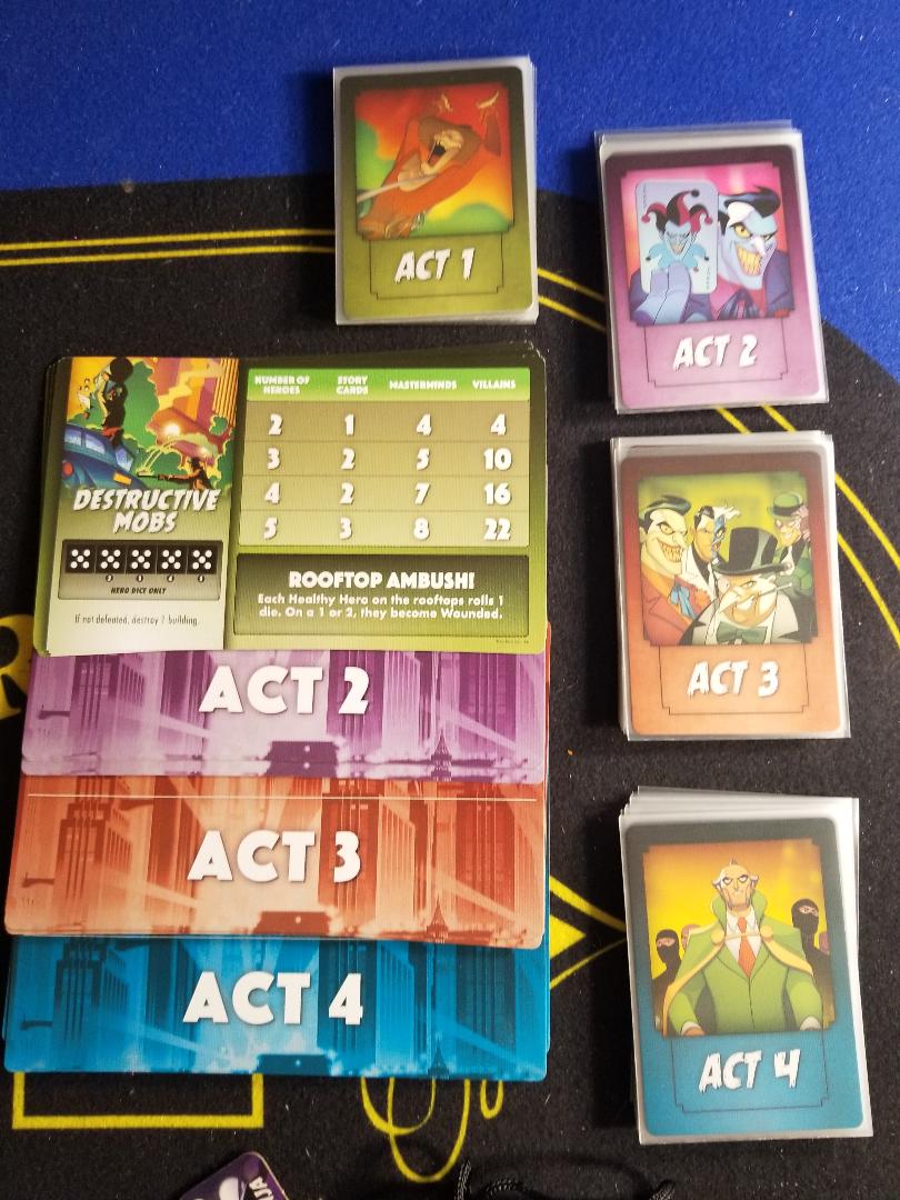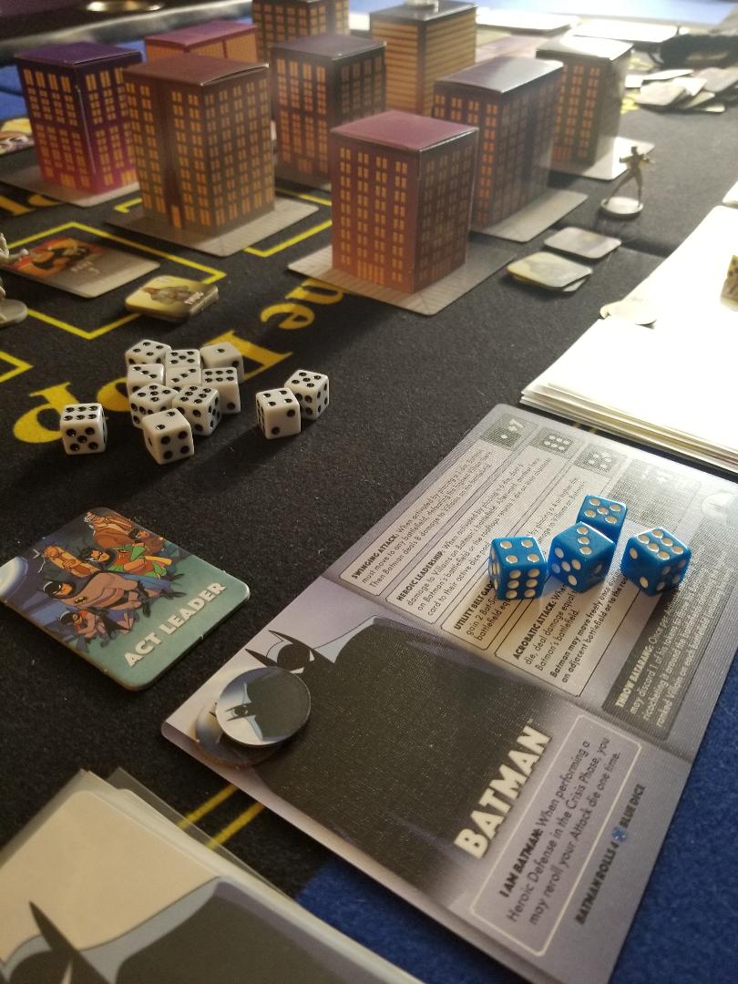 So first you roll your 4 starting dice (might be more depending on other rando powers or abilities) then you take ONE of those dice and place it. So you have to strategize a bit to determine if you want to focus on clearing out villains and henchmen from the streets or if you want to complete missions to try and prevent super bad things from happening. These bad things come in the form of buildings getting destroyed or more henchmen coming out etc. That’s basically it though, you roll, place a die, roll, place a die. Do this till all your dice are placed, then check to see if any missions were not completed and resolved their effects, check to see if any henchmen or villains are still on the streets and if so they will try to make an attack on buildings. If you survive, then move on to the next Act.
