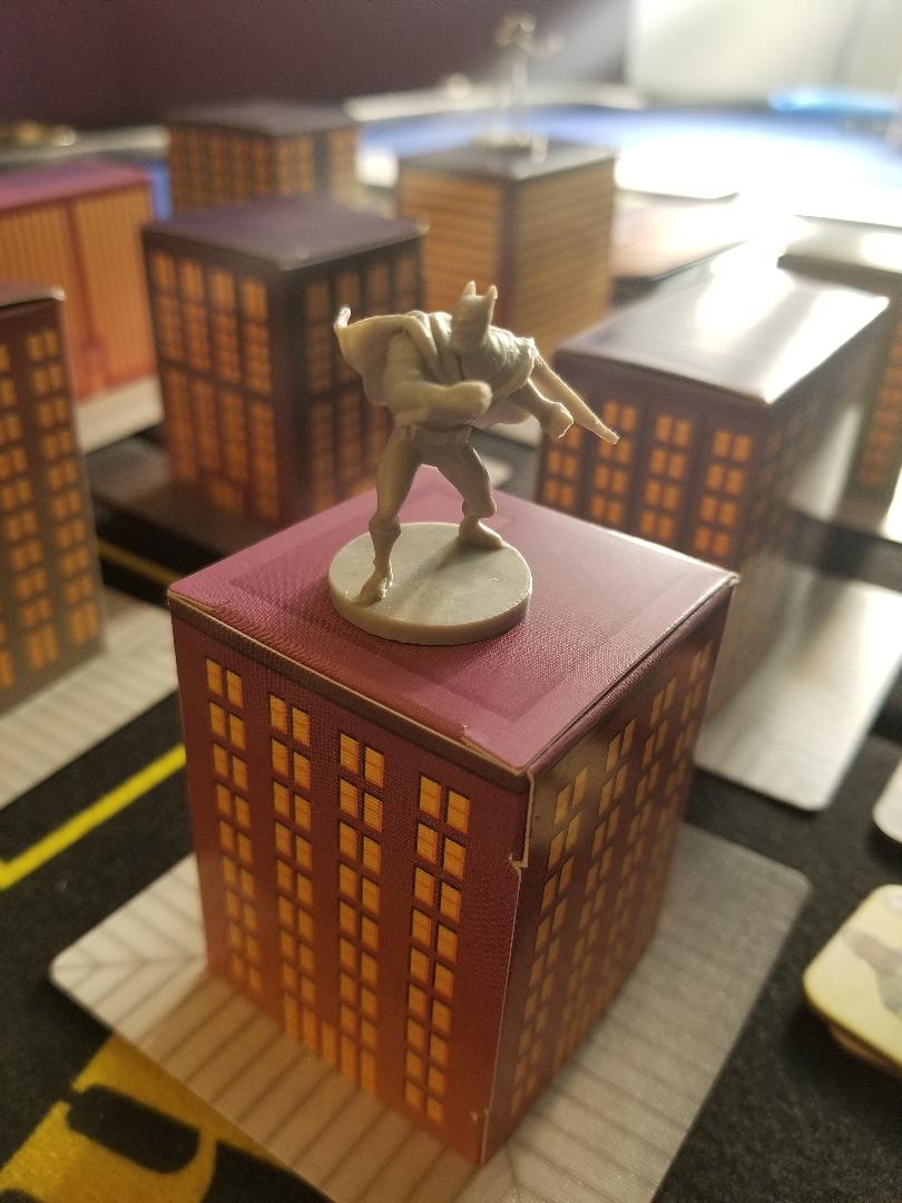 The components are your average fare. The dice are colored to match the individual heroes and are smaller than a typical die, which I like. All the cards are of a decent quality, no complaints there. The minis are actually very nice, pretty detailed and I can already tell they are going to be fun to paint. The game board aspect of this game is actually what drew me to it in the first place. The “game board” is the city buildings on top of the little sidewalk cards. As the buildings get destroyed by the villains, you remove buildings and turn over the sidewalk card to expose the after effects such as civilians dying or explosions. A very cool setup.