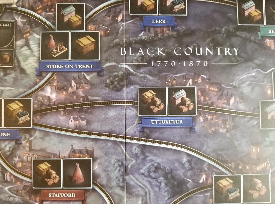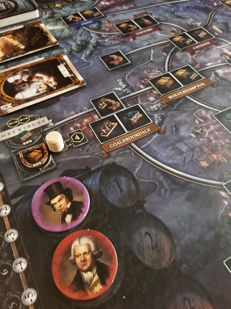 I REALLY love the visual aspect of this game. The board looks amazing with the style and artwork. Not only that but the main game board and all the player boards are double sided. One side has the darker artwork of nighttime complete with painted on lit lanterns and the other has the day time look and feel to it. This doesn’t change the gameplay at all but it’s these little things like this that really stand out to me with games. The theme is really great as well, taking place during the industrial age of England with various city names adorned on the game board and the surrounding landscape painted in-between with the railroad and canals painted to connect the cities. The outer edges of the board have very elaborate drawings for the VP track and everything just looks….fancy. This is a very beautiful game indeed.