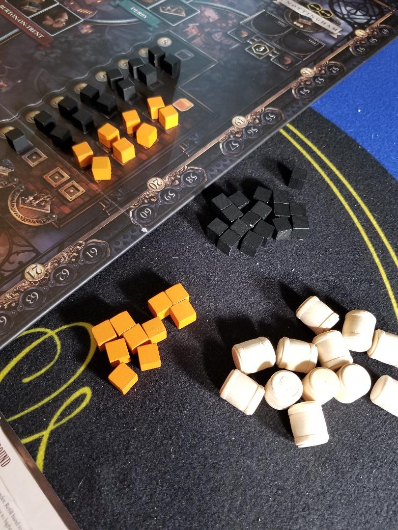 Excellent quality components here. The cards all feel nice and the tokens are of a good quality with some wooden squares for the iron and coal tokens and some wooden beer barrels that are shaped like little barrels. The cardboard stock they use for the player board tokens are thick and feel very sturdy.