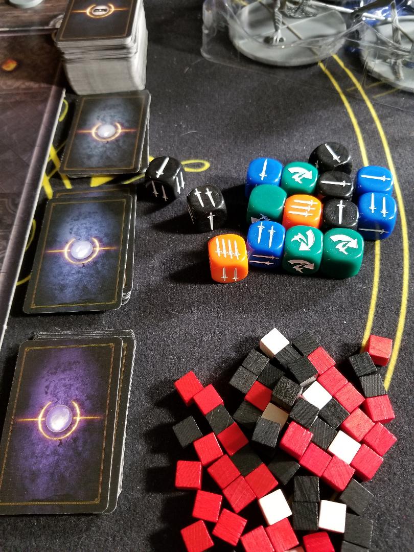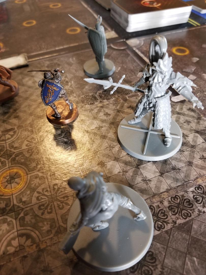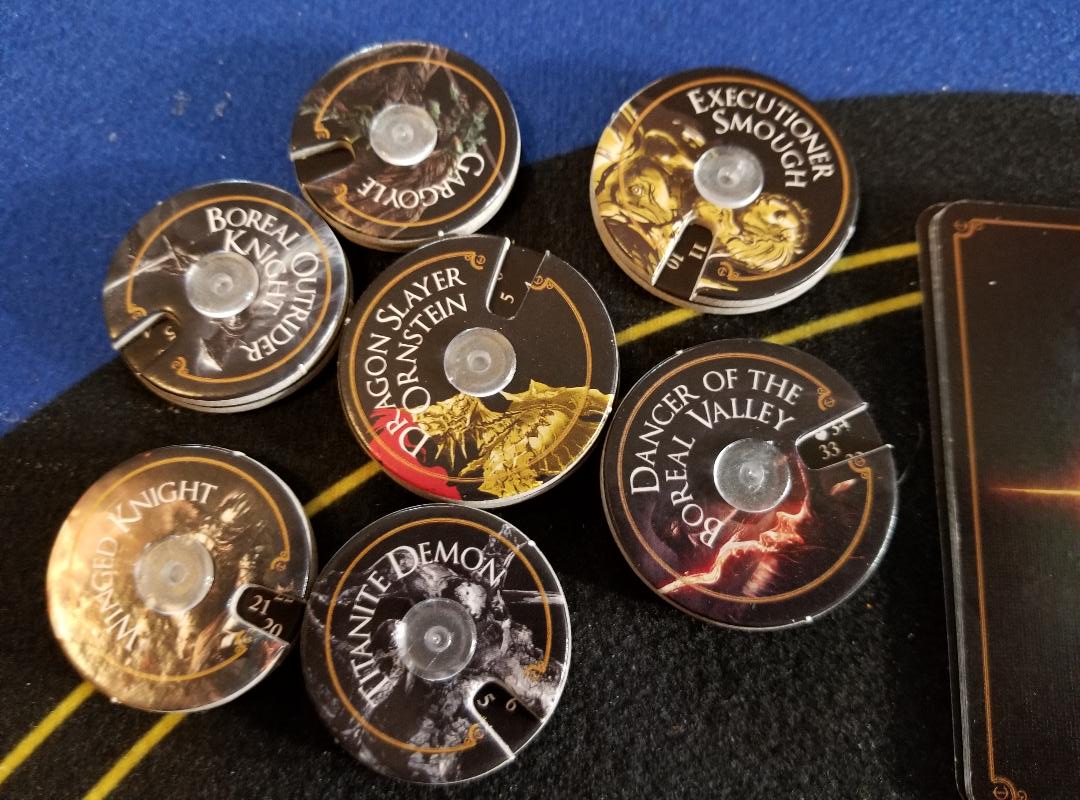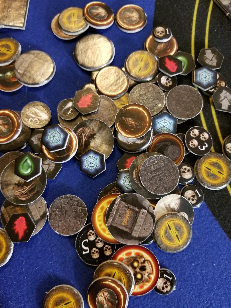 The minis are extremely detailed and look JUST like their video game counterparts. I am extremely pleased with how these all turned out and even painted the knight. There are quite a few different bosses to choose from as well in the core set all with completely different sculpts. The tokens (and there are a lot of them) are all pretty basic cardboard, nothing fancy. The dice however are really nice custom dice and have a premium heft to them. The cards have a nice linen finish and all look great with artwork straight from the videogame. The game board tiles themselves are all oversized pieces and the cardboard is decently thick. I have a little tiny bit of warping occurring but nothing outrageous. Overall, I am very happy with the component quality in the game.