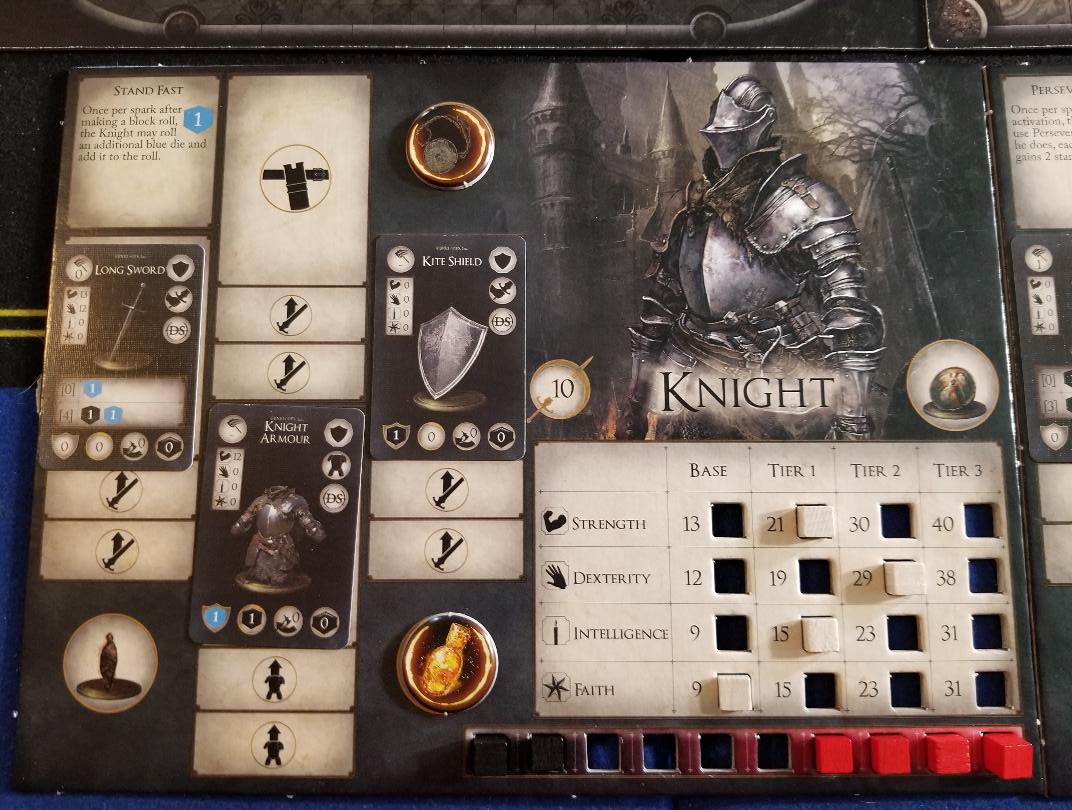 Speaking more on the game board tiles they are double sided with a few different scenery choices to choose from but when you are playing that is all just to add to the theme, there is no gameplay benefit from the tiles. When you are setting the game up it even tells you to just pick whichever tile, I really wish the different tiles offered some differing advantages or disadvantages such as terrain. That said, there are barrels and tombstones that sometimes get added to the tiles to shake things up a bit. Also did I mention the player boards? Cuz they are AWESOME. There are four of them and they have spaces punched in the board to hold wooden cubes to track endurance spent, health and stats for leveling up. It’s basically a poor mans double layer player board but I love it nonetheless. They also look cool with the Dark Souls artwork and spots to add the mini cards for the gear.
