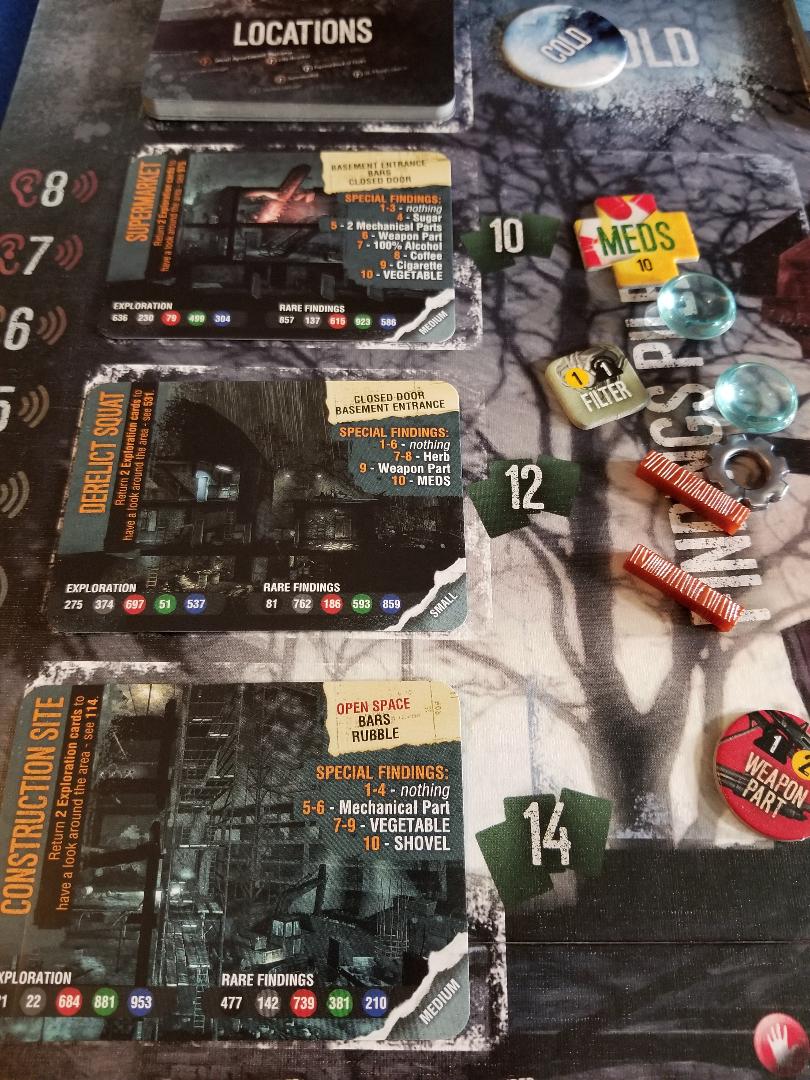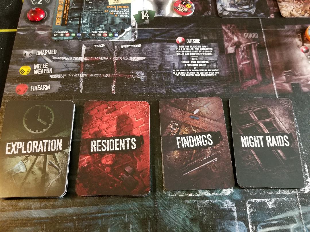 I talked about the game board a bit earlier with all the draw piles all over it. But basically you have draw pile spots for everything from things you can build in your shelter to locations you can visit to the loot piles you will scavenge from. There are also cards laid out over specific rooms in your house that you must clear out to find what loot they hold like rubble piles and furniture. The board is double sided with one side meant to be played by more advanced players and the house setup is a bit different. It alters the rules a tad on a few things so once you learn the basic gameplay then flipping the board and playing on that side would create a different experience which adds to the replayabilty of the game. The board is a pretty good size so it will take up a good amount of table space as well so be prepared for that.