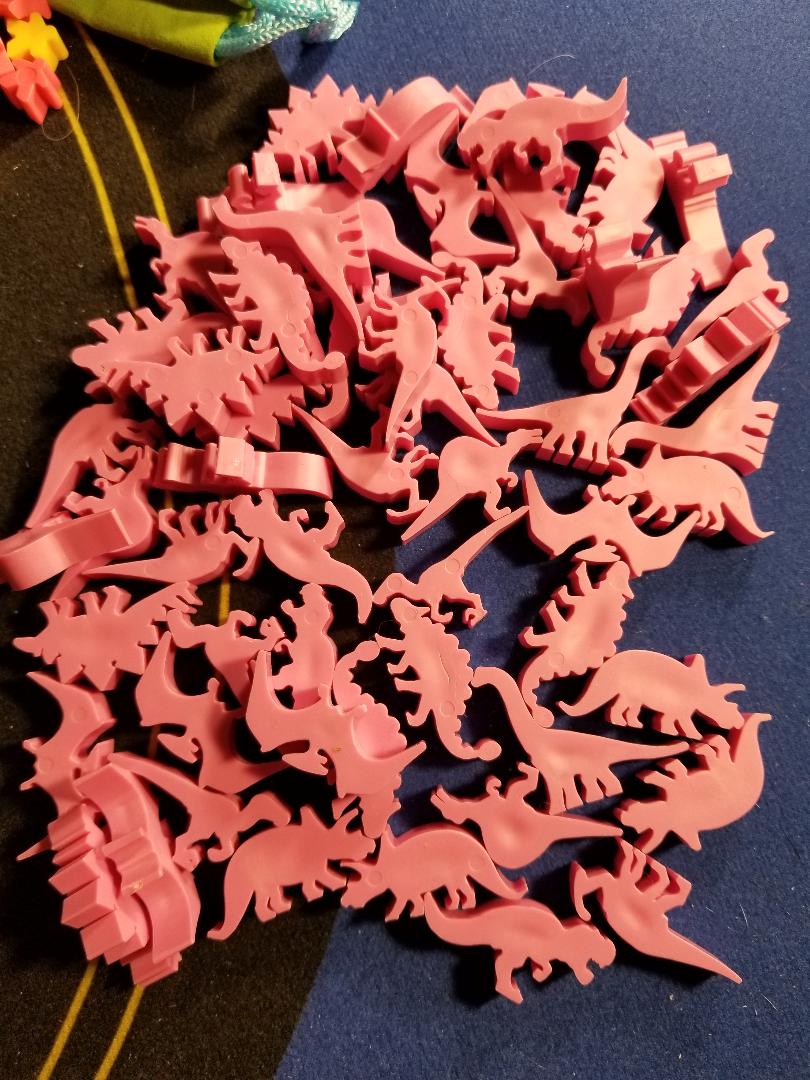 Great components! Absolutely fantastic. I mean once you get past the fact that this game is entirely 90’s based dinosaur action (which is amazing) the components are still great when compared to other board games. The dinosaur tokens are plastic and there are a ton of them, hot pink in color too which doesn’t bother me any. The oversized DNA amber colored dice look amazing with the different kinds of DNA you can acquire printed on the sides. I love how they are amber colored as well, like the tree sap the mosquitoes get trapped in, love it. The cards are all pretty typical card stock, nothing fancy there.