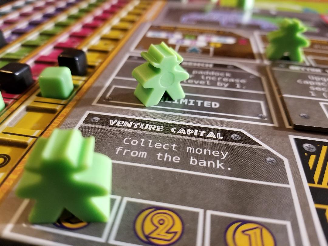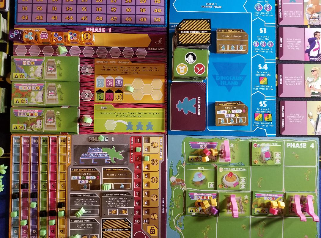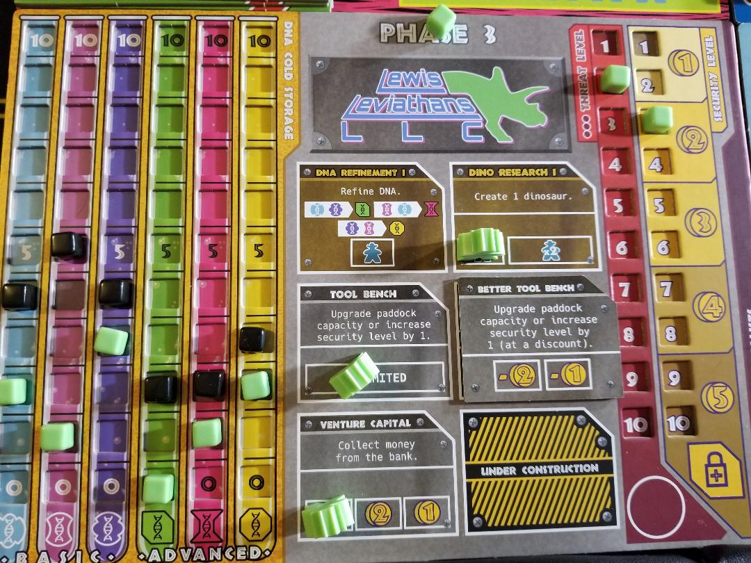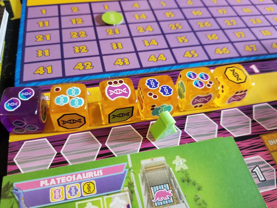 This game doesn’t really create much table talk which is pretty standard with worker placement games in general. I spent more time talking to other players asking them to pass me some dinosaur meeples from the pile across the table. There is some bickering to be had during the first couple phases as the first player to go every round is the payer with the least victory points. Which kinda creates this strange rubber band effect where if you get behind, you have the opportunity to catch up because you get to go first till you do. Which means you get the first choice on DNA that gets rolled or the first dinosaur. Plus the first pick of attractions, lab tiles or specialists.