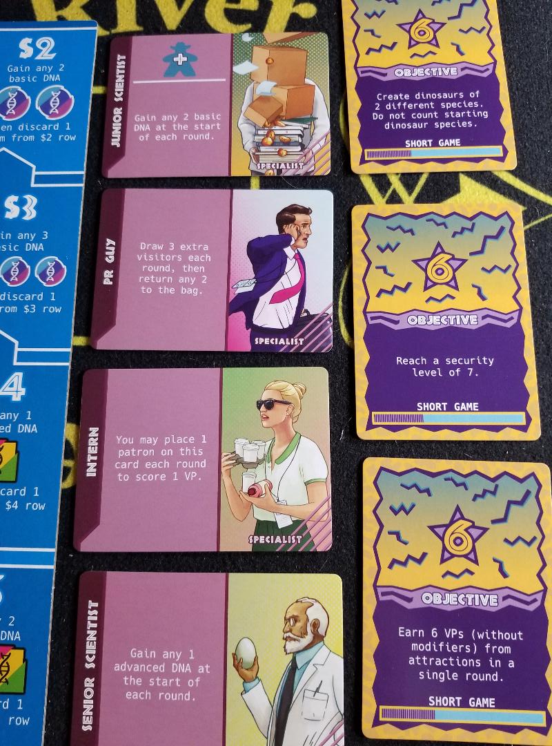 The gameboard is comprised of multiple smaller boards based around the different phases the game takes place. The phase 1 board has the DNA dice placements, the different dinosaurs you can create and spots for improving your DNA storage and passing. The Phase 2 board has spots for the draw piles of the attraction tiles, lab research tiles and specialists cards. Phase 3 board is your personal double layered player board where you place your worker meeples to take actions such as creating dinosaurs for your park or improving your security. Phase 4 is your park board where you reach into a bag full of patron meeples (and a few hooligan meeples) and pull out as many as your excitement level to see how much money you get for admission. Then place patrons based on how many attractions and dinos you have. Then see if the threat level is higher than your security and if so……well…..yum yum.