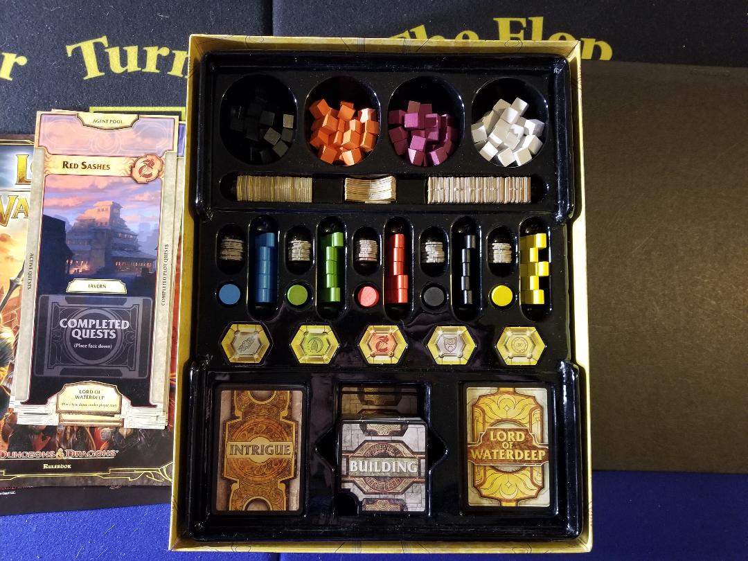 The game board looks pretty cool with a map of the city of Waterdeep and spaces for new building tiles to be constructed which in turn opens up EVEN MORE places to place workers. There is a nice VP point tracker that goes all the way around the outer edges of the board and dedicated spaces that are labeled for the different card decks. It’s a very well put together board for sure.