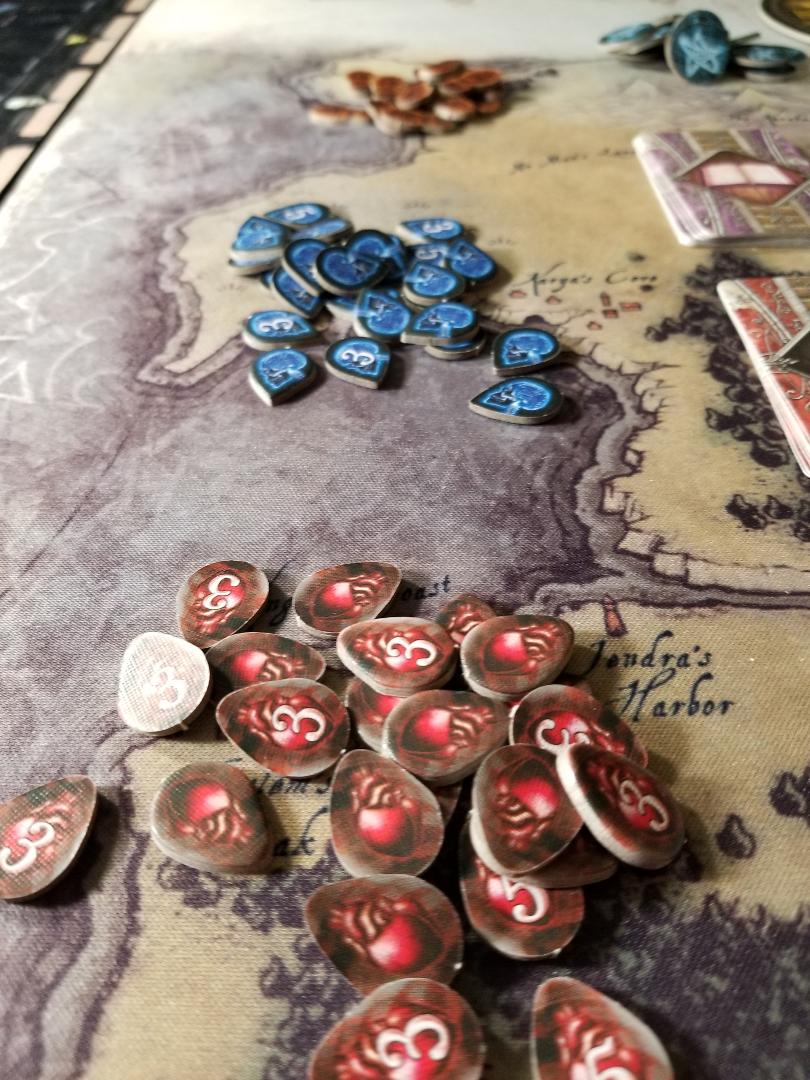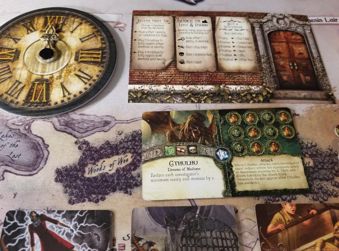 There is quite a bit of table talk considering you are all working together to seal away the elder god. You are encouraged to discuss strategy with other players on what locations you want to tackle or if you need to trade items or heal etc. Also the randomness from the dice rolls and monsters create tension which I just love. I know there are some people out there that hate randomness in games…..my wife being one…..BUT I think it adds to the tension and makes this game in particular more exciting.