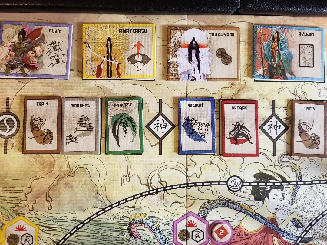 So as these tiles are selected they are laid down on the board in specific spots along this track and once you reach a certain point on the track other things happen such as collecting the benefits from worshipping certain Kami (if you place one of your Shinto minis there that is). There are 7 total spaces for these tiles so everyone around the table gets a chance to pick a tile and partake in the benefits during each season.