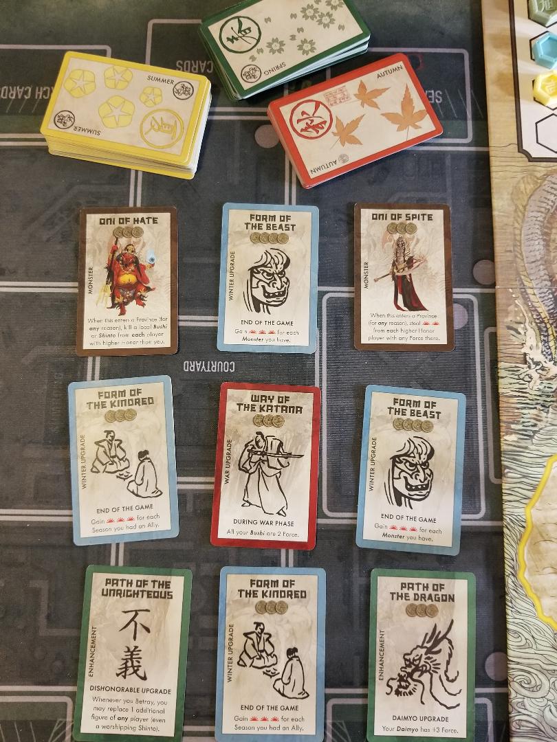 OH! And you can form alliances…..and commit the dreaded BETRAYALS!! So let’s discuss this a bit. At the beginning of each of the seasons you actively discuss with the other players on making alliances. You want to make an alliance if it benefits you in some way BUT you need to make sure that you reap more out of the deal than the other person in some way because there is just one winner and that’s YOU. So yeah be strategic. One of the tiles you can lay down is a betrayal tile which basically breaks your alliance immediately and allows you to replace any 2 troop minis on the board with 2 of your own. A very powerful ability, HOWEVER you also suffer a loss of Honor. Honor basically breaks all ties in this game and now I know what you’re thinking. “How many ties could there be in this game?!” Well let me tell ya it happens a lot more than you would expect. I was surprised at how many different aspects of the game were so evenly matched that they lead to ties. So honor is for sure something you want to have.
