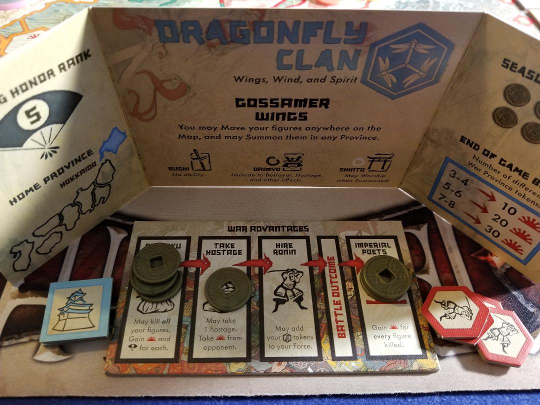 Once you get the 7 tiles laid down which basically end up consisting of moving your troops around the board to different lands and adding more troops and just generally strengthening your clan in one way or another, you then move on to the war phase. During the war phase you visit each land (which are assigned a random number at the beginning of each season) and if there are multiple troops on that particular land of different clans, they do battle. The battling is actually really innovative as well. You have a player screen that is up so the other players cannot see your decisions and you assign coins that you can accrue during the previous phase to specific spots on a war card you each have. Then reveal the cards at the same time and see how has won each specific type of battle based on who put the most coins on each spot if any. It’s basically wagering against the other player on the battle but here’s the interesting part….if you win the land from the battle you have to give the coins you wagered to the losers so even if you lose you still have some power in case you have to do battle again before that season ends. It’s a really interesting way to keep players in the game and not feel like a loss is like a TOTAL loss. The winner of course gets the victory point value for capturing that land. And Victory points are the key to winning.