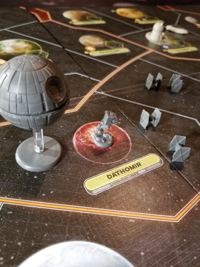 First the Rebels. Right at the beginning after each player has placed down units and systems have been chosen the Rebel player picks a system in secret. This is the hidden base system and it has a specific spot on the board so the Rebels can furnish it with troops during the game and not give away its location. So the Rebels are unique in the fact that only they get to draw and work towards these objective cards. The Rebel player gets to draw one at the end of each round (Refresh Phase) and these things have a variety of things to accomplish so the Rebel player can slowly move his objective tracker down the board. They do take some time to complete and you can only complete 1 refresh one per round and 1 combat one per round so don’t be expecting to save a bunch up for a sneaky win outta nowhere. Also the board state changes quite often as far as where units are so if you can complete one…..you better complete it. Once the Rebels objective tracker meets the games basic round tracker, the Rebels win! It’s important to note here that the Rebels are greatly outnumbered in the game. Don’t go into this expecting to fight the Empire head on militarily. As the Rebel player you need to be concise and sneaky, sabotaging Empire production lines, gaining loyalty in systems to garner support etc. Your mission is to survive and hinder the Empire long enough to pull out a win, keep them chasing their tails.