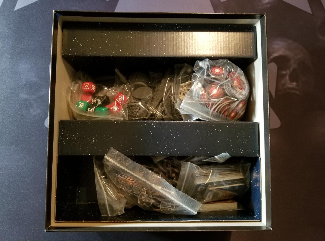 I usually complain about Fantasy Flights boxes and storage as every game they release has the most pitiful excuse for an insert. They make their inserts MOSTLY for shipping punchboards. Luckily this games insert isn’t all that terrible. I mean it’s still the same old thing we’ve come to expect with Fantasy Flights inserts but with this game it works ok. The box is deep enough that once you bag up the components they fit down into the recesses of the insert and the boards and instruction booklets sit atop it nicely. The lid goes on and everything stays in place.