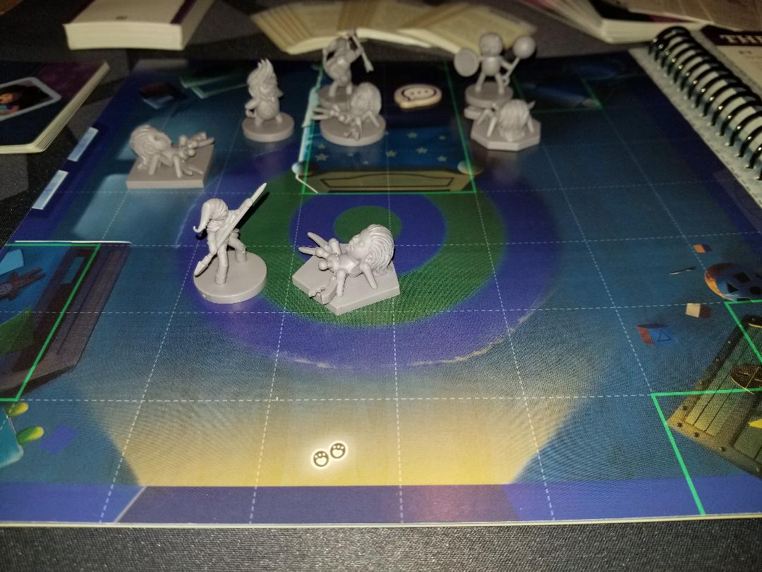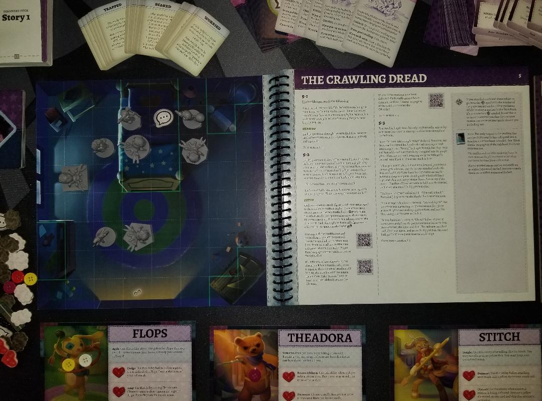 So the game is this VERY THICK wire bound story book. Within these pages lurk twists and turns, ominous settings and fun adventures. When open the left page has the “gameboard” and the right page has the story elements that you read as well as any special rules for that particular map. The game length really depends on how long you want to play. I would say 1 page should take 20-30 minutes for a beginner, probably faster for an experienced player. Of course just 1 page is just a small portion of the story. For our family we would usually do 3 pages which equaled about an hour and a half and then we would mark our spots and pick it up again another night. To win you just have to complete whatever mission you are tasked with on that particular page. Sometimes it’s battling minions and other times it’s exploring a new area. There are a ton of different things going on in this game and none of them are overly confusing.