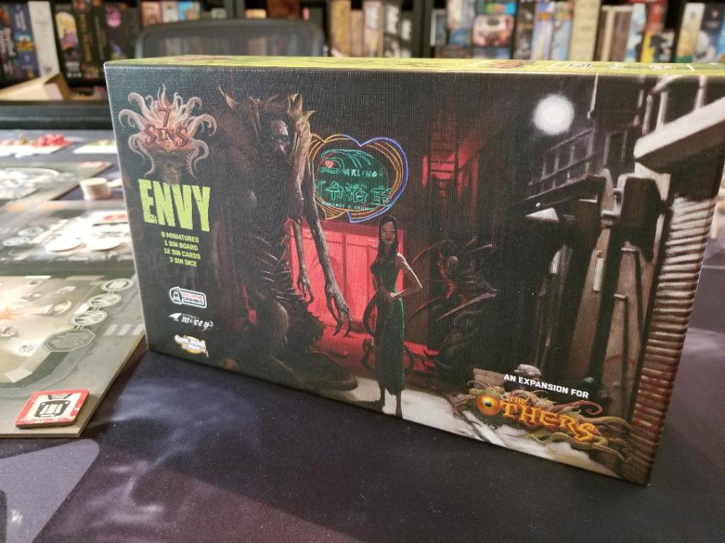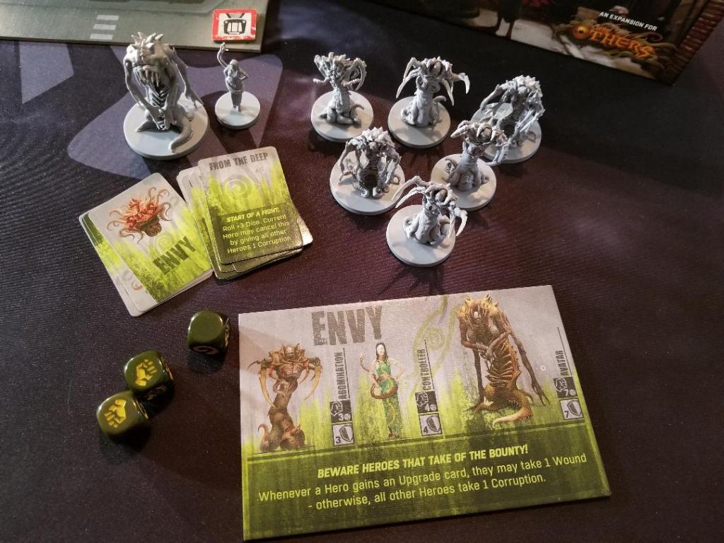 The Envy expansion adds a new deck of cards for the sin player and a new overall power on their board that gives players an interesting choice when picking up upgrade cards. Either that hero takes a wound, OR every other hero will take a corruption. It’s an interesting trade-off and a nice way to bring out the Envy theme here where those other players may seem “envious” of the player gaining an upgrade and becoming more corrupt in the process.