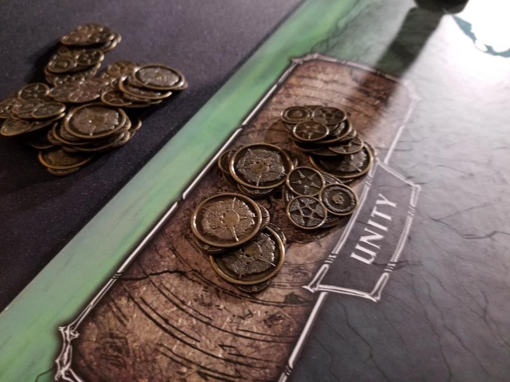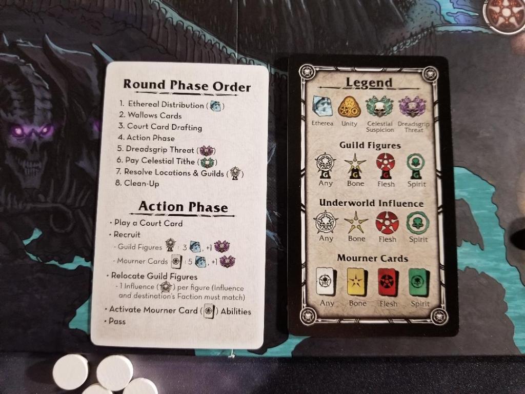 The last thing to do is the Clean-up phase. This phase removes any unused Wallows cards, gains benefits from certain Mourners cards, you flip back over any used mourners’ cards to be used next round. And finally check to see if there are unity coins left on the board, if so, start the round over and continue playing.