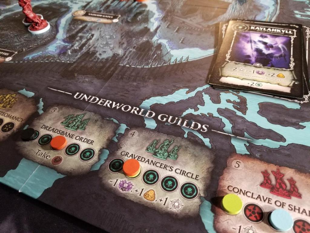 Next phase is to resolve all the location and faction areas on the board. Basically, whoever has the most units on each location gains the benefit of said location. Then you go through each factions (Guilds) areas on the bottom of the board. These are the areas you will increase whenever you gain a specific unit model. Each faction has two different Guild areas, each with a different sculpt of miniature to denote the difference. So, whoever has the most units of a particular miniature will gain that guilds benefit. Also a thing to remember about this game is that anytime there is a tie, NO ONE will gain the benefit, UNLESS you have the Death figure in which case you are allowed to break a single tie during a round.