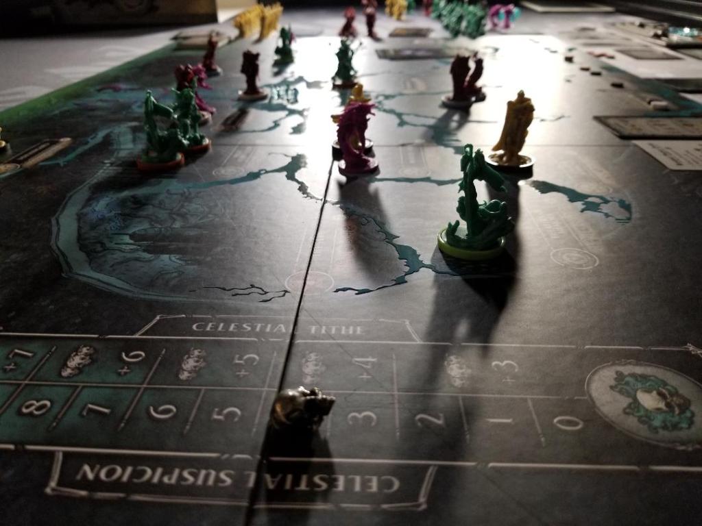 The next phase is to “Pay Celestial Tithe”. This is where that ethereal that might have been sent to the Dirth Forge at the beginning will come in handy. Going around the table players take some (or none!) of their own ethereal from their player boards and hold in it their closed hands. This represents how much they will give up for paying the tithe. The amount needed to pay is determined by the Celestial Suspicion Meter, this will rise and fall mostly dependent on what Court cards actions are taken during the Action phase. The base line amount needed to pay is 3 + number of players and only goes up from there. So first the amount of ethereal is taken from the Dirth Forge as payment towards the tithe and then players contribute their own. Once everyone has placed some or none in their hands, they reveal! Now IF the amount of tribute is sufficient to pay what is required the person that contributed the most gains 3 unity coins and all other that contributed gain 1 unity coin. However, if a person did not contribute then they lose a single influence point in a faction of their choosing. BUT if the amount was not met then that raises the stakes for both the Celestial Tithe AND the Threat meter and players who contributed the lowest lose unity tokens.