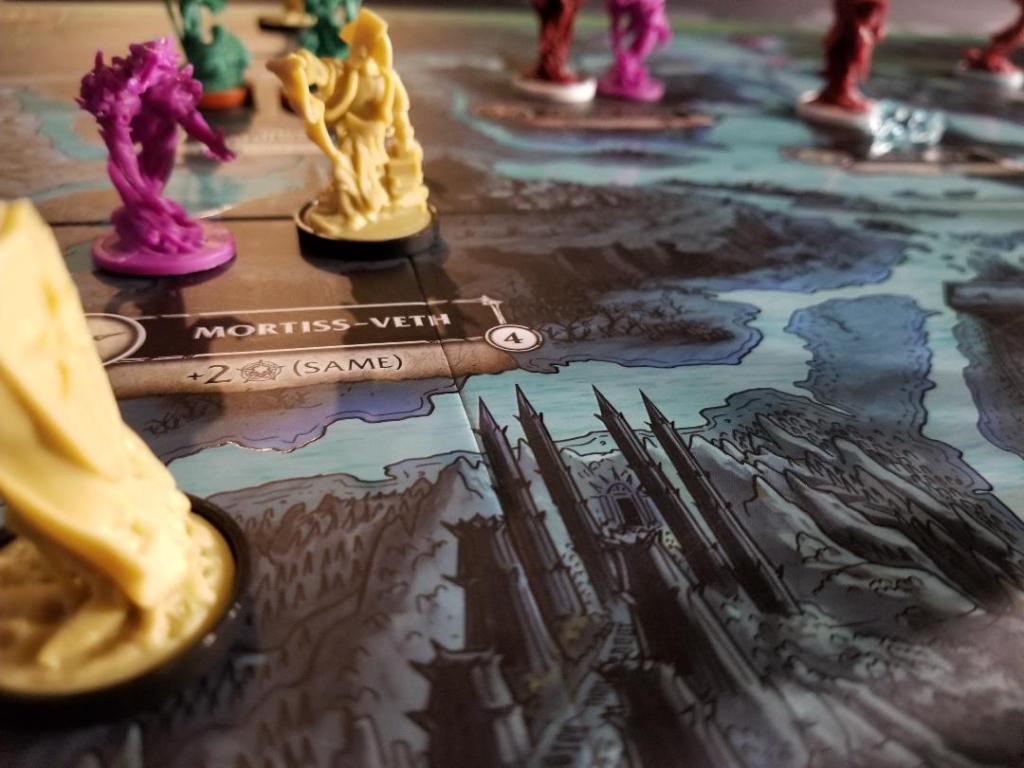 During the Action phase players will take turns performing a single action around and around the table until everyone “passes” and then the rest of the round’s phases transpire. In the Action phase players can play one of those Court cards I mentioned earlier, recruit faction figures or collect mourner cards by paying ethereal, move figures around the board or from their player board by paying faction influence, activate abilities on their played mourner cards or complete quest cards which include fighting those pesky Rakers.
