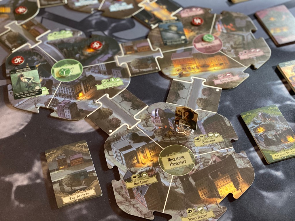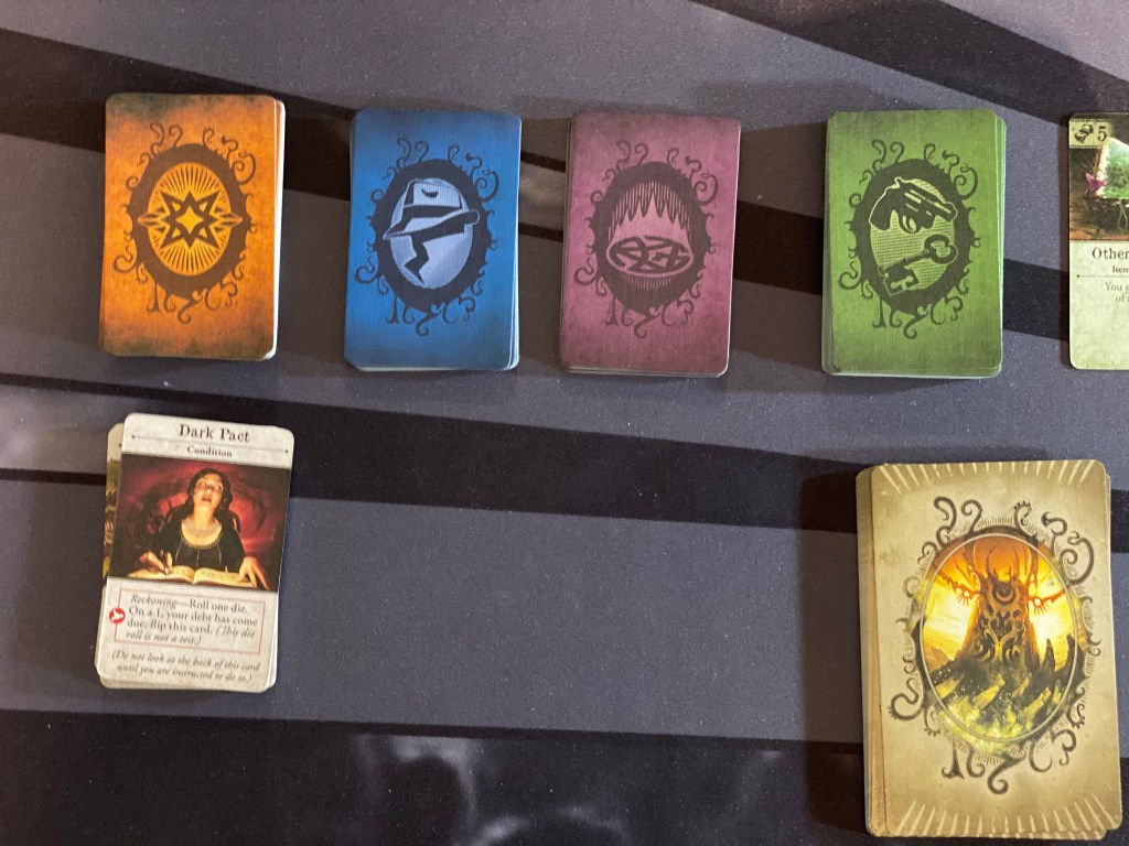 As far as replay value goes this game has lots of it. Let’s see where to begin……There are four different scenarios with four different elder gods to choose from starting out that each have a completely different setup and specific event cards pertaining to their story. The game board tiles are double-sided and each one has its own specific deck of event cards that goes with it. On top of that each tile has three different areas so that when you draw an encounter card, you will only read from the specific area you are in of the three. This creates a bookoo of variability between plays even if you play the same scenario twice.