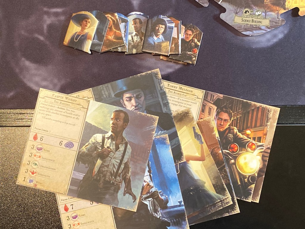 You know I probably own more Fantasy Flight published games over all other publishers and can say that their components have gotten better over the years. I mean the tokens are pretty standard but the cards all have a really nice linen finish and look fantastic. And yes, there are even a bunch of those mini cards included that Fantasy Flight loves. There are no miniatures to represent the characters you play as, instead your character is a standee which honestly for these kind of games is just fine. If you happen to own Mansions of Madness 2nd edition you can probably dig out all the miniatures from that game and use them here as they use the exact same characters throughout all of their Arkham files games.