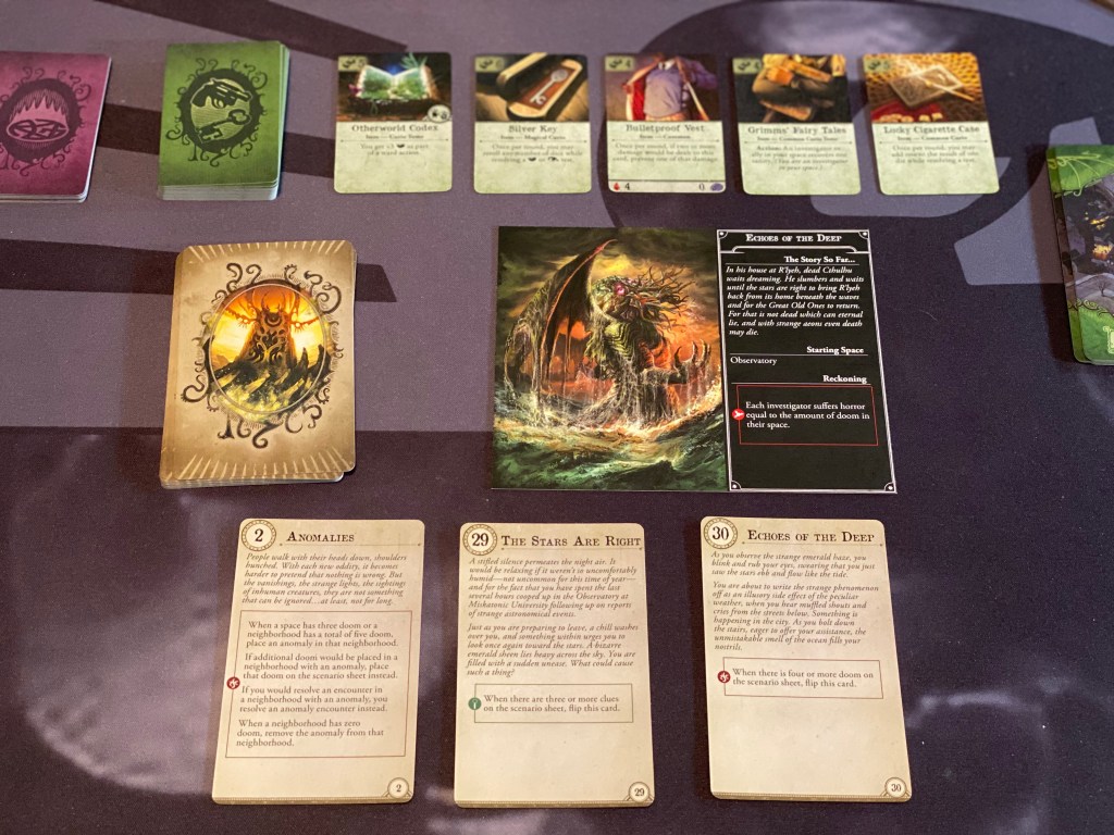 And that’s the basic gist of the game, sounds easy peasy right? Well hold your horses here, this game is anything but easy. First of all, there are specific objectives players will be needing to work together to complete which usually boil down to collecting clue tokens and removing doom tokens. These objectives are told through a series of cards that are read to the players and set out to reference at the beginning of the game. If too much doom pops up on the board then bad things can and will happen that will usually cause a new card to be brought out that will enhance the Elder Gods schemes or awakening. However, if players can successfully collect enough clues and research them (through an action) that will activate a different card that will further the story and give players a new objective to complete to try and defeat and or disrupt the awakening.
