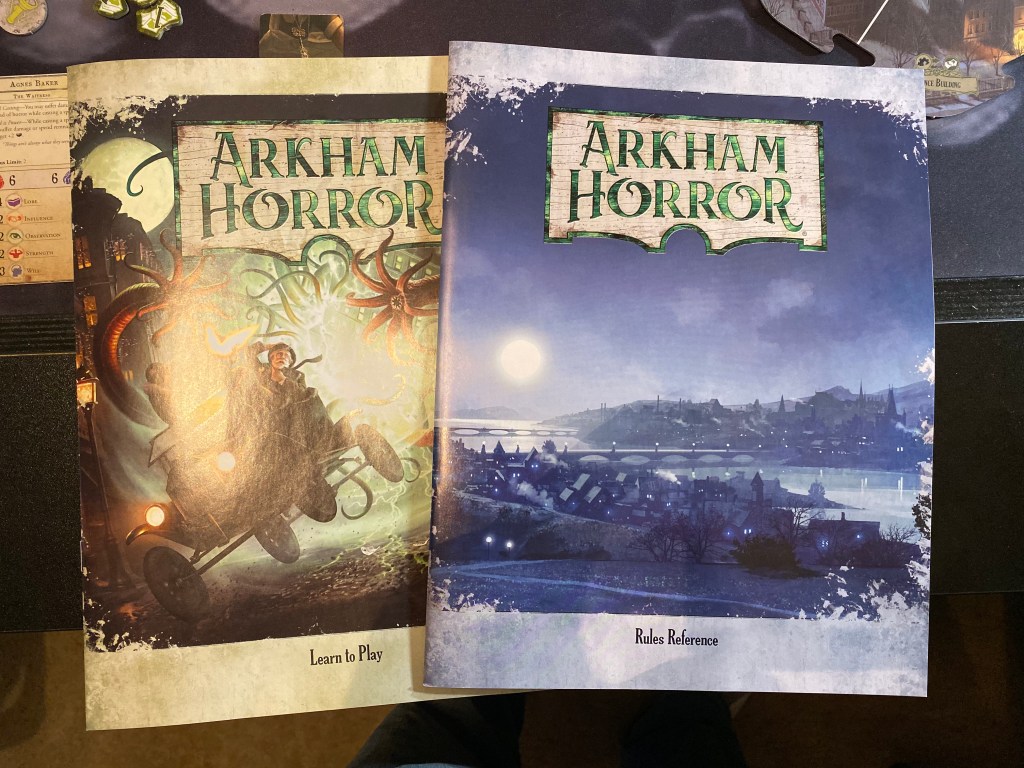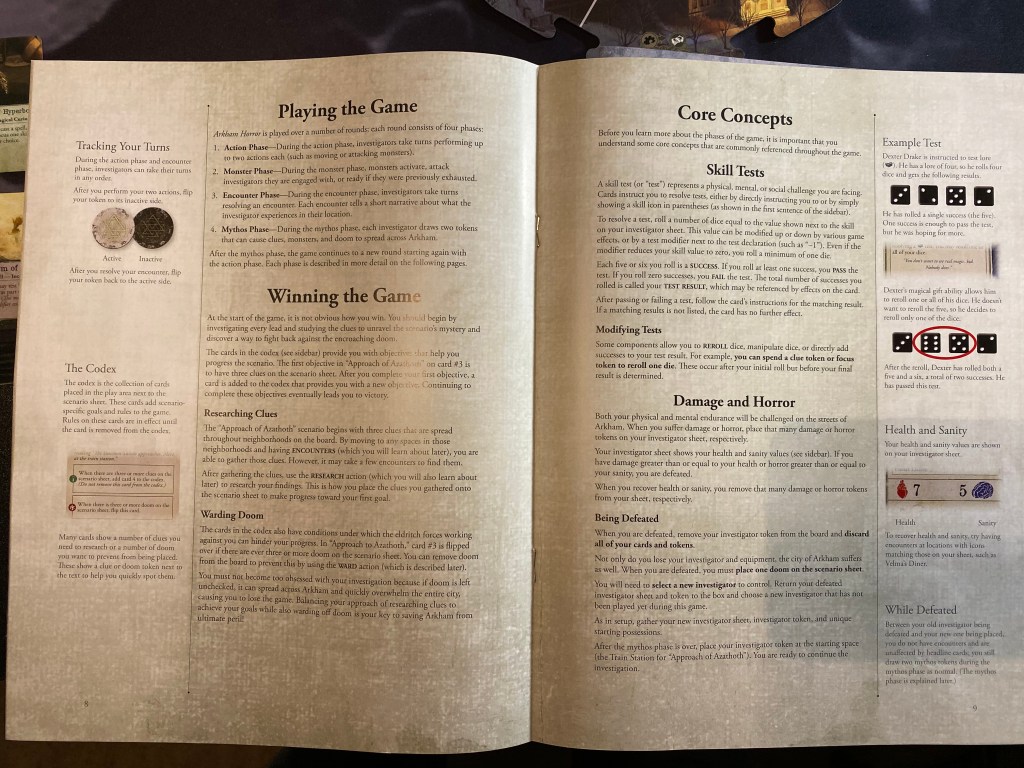 I was extremely impressed with the rule book here. This is the standard Fantasy Flight system where there are two books, one “Learn to Play” book that explains setup and basic actions to get you up and going and the other “Rules Reference” that is basically a giant index of all the stuff you will need. They did a great job of getting me playing quickly although the “starting” scenario they choose is basically the hardest scenario of the four the game comes with (personal opinion). Personally, if you want a good starting scenario, I would choose the “Feast of Umordhoth” scenario as you don’t have to deal with the Anomalies mechanic with that one.