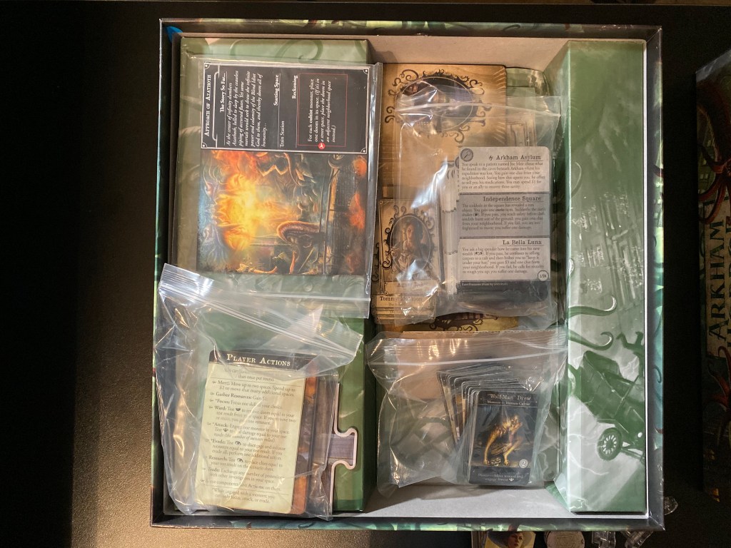 So, this is the 3rd edition of Arkham Horror to be released and my first foray into this particular series as I have never played the 1st or 2nd editions. However, I do own Eldritch Horror (which I still need to pop a review out for….) and have partaken in other Cthulhu themed games such as Elder Sign, so I had a decent glimpse of what to expect with this one. Over the past few weeks I’ve been playing quite a bit of Elder Sign and have been enjoying it but I was craving just a bit deeper of a game so I finally bit the bullet and grabbed up Arkham Horror 3rd edition. Let’s see if it has quenched my craving for a deep Cthulhu themed board game.