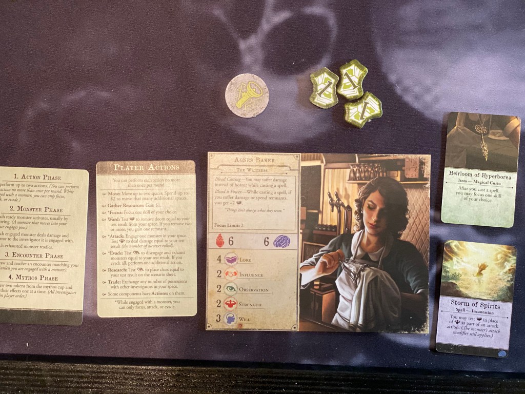 So, the way the game balances player count is pretty clever. You see, you can easily just whip the game out and play it solo with zero rules changes, using just one character if you want. The only thing that changes is the amount of drawn Mythos tokens at the end of every round. Since each player draws two tokens you can have just a couple possible negative things or up to 12 things happen every round. And there are a couple good tokens in there that place some more clues but overall they are not helpful to your objective. Of course, playing with more than one also opens up the amount of ground you can cover AND items you can acquire and trade. I think playing a solo game with two characters is fun but have also had a blast playing with 2 players and also 5. I haven’t tried with a full six yet but honestly don’t think it would be too terrible considering there is very little downtime. You see during the action phase each player only gets two actions and they are very quick usually. Not only that but there isn’t exactly a player order per say as players can talk amongst themselves and choose the order they want to go depending on their situation. Because of this, the game keeps everyone engaged very well.