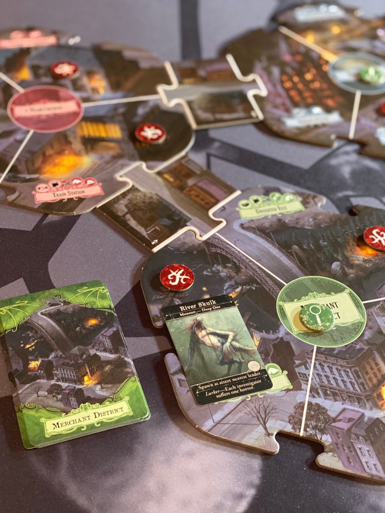 In Arkham Horror you and up to a total of six players will be working together to basically prevent an Elder God from entering our world and destroying it. To do this, players will be moving around a modular game board performing two actions each such as fighting monsters, removing those dreaded “doom” tokens and collecting clues to unravel the mystery of how to stop the old one from awakening. Once all the players have used up their two allotted actions, the monsters that are on the board or engaged with players will activate and move about or carry out their attacks. After that players will each go through an Encounter Phase which consists of reading a specific card drawn from a specific location deck that they reside in. Pass or fail the encounter, once all players complete those, that ever ominous Mythos Phase happens which causes players to each draw two tokens from a bag and resolve their effects which are for the most part not good.