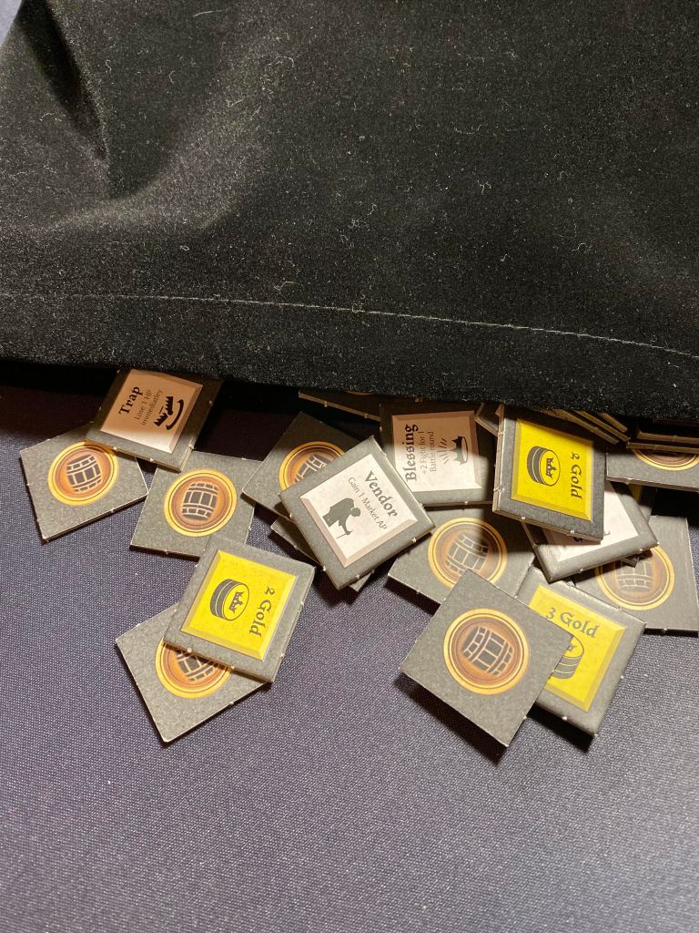 Nothing overly fancy about the box. You will want to bag up everything in specific bags as there are a lot of different card decks and tokens. This does make the game a bit of a bear to setup due to the large number of different decks that need shuffled and the variety of tokens to sort. Although there are a couple felt bags that can hold some things such as the dice and the many treasure tokens. The box is very compact though so it will easily find a space on a shelf and everything fits back in very nicely.