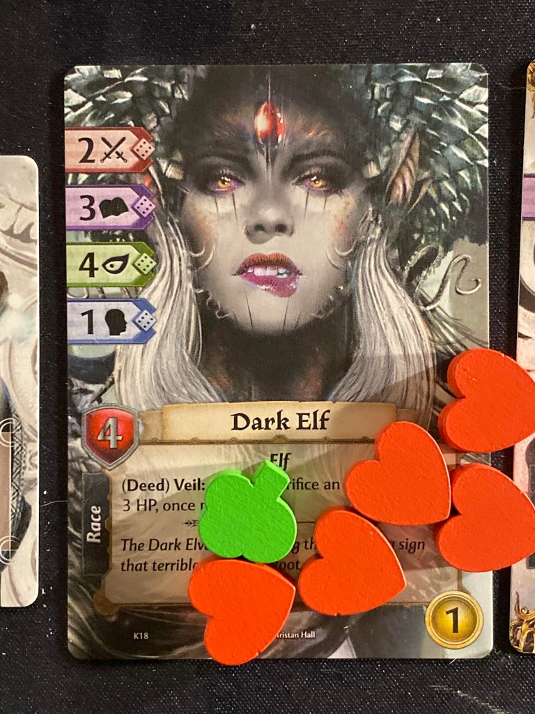 The theme is pretty generic fantasy with all the races and classes boiling down to typical fantasy tropes BUT the artwork is INCREDIBLE. Adorned throughout all the cards from the locations to the regular items you will find this outstanding artwork, and it never fails to impress. Heck one of the biggest reasons I get so excited to play this game is just for exploring around and getting to flip over a new encounter JUST to see what new visual candy I get. The flavor text on the cards is also really well done and adds to the art very well. And I know I said it’s just generic fantasy, but, this is REALLY well done generic fantasy. I mean the Dark Elf female race card looked so awesome that I didn’t even have to look through the rest of the race cards to pick one. I saw it and was like, “YEP gimmie that one, I don’t even know her strengths or weaknesses but she looks awesome”.