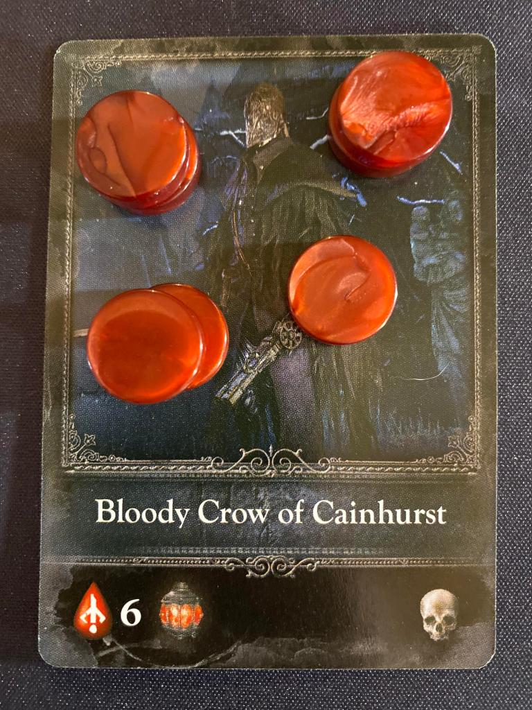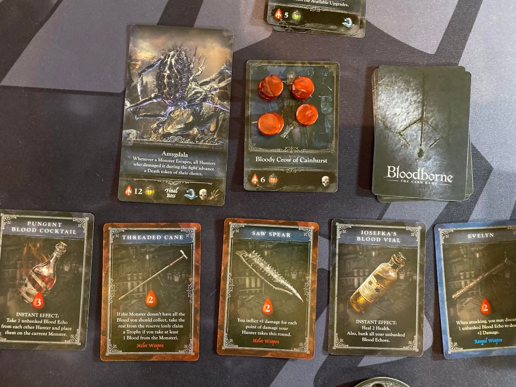In Bloodborne: the card game players will be working together-ish to take down monster after monster collecting trophies and new items all in a concerted effort to collect blood tokens. Eventually after enough monsters have been destroyed or escaped, players will confront the final boss of the chalice dungeon. Once that monster is vanquished players will total up their collected blood tokens and points based on how many collected trophies they have from monsters they battled. Whoever has the most points wins!
