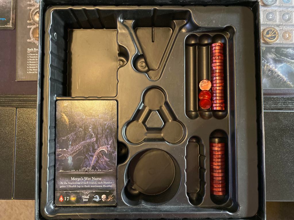 The game has some pretty nice components! The three dice are nice looking and have a good weight to them and the round dial life trackers are fun. Each player board is a nice thick sturdy cardboard of which I have not experienced a lick of warping from. All the cards are of a nice quality, some of which are oversized (the final boss and Rune cards). The plastic blood tokens are really nice looking with a bit of a marbling effect held within. There is no game board as each player monitors their trophies and blood tokens on their individual player boards and the cards for the monsters just sit on the table in the middle.