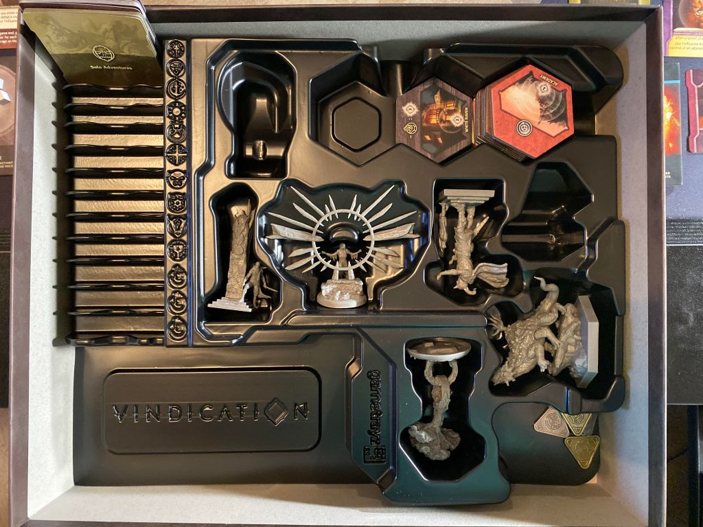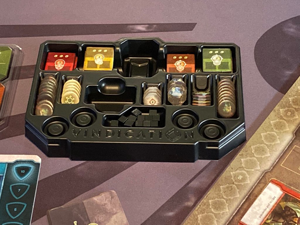Gametrayzzzzzz yusssssssssssssssssss. I go wild for a good storage solution as most of you probably know by now. Vindication hits all the right marks here. Each character has their own Gametrayz plastic holder which holds everything needed for them nice and neatly. There is another tray that holds most of the rest of the components as well. Heck even the lid of that tray doubles as a holder for the prized Mastery tiles for end game scoring. Inside the box the plastic storage solution is excellent having individual spaces for each different deck of cards and all the tiles. I mean the dice have a spot, the player boards have a spot, the bag has a spot. On top of all that, once you get everything in the box, it all holds in place if turned on its side! That was an impressive feat considering the way the cards are stored and I fully expected them to be all mixed up but NOPE!