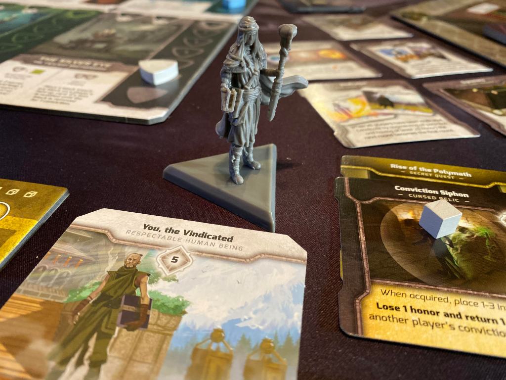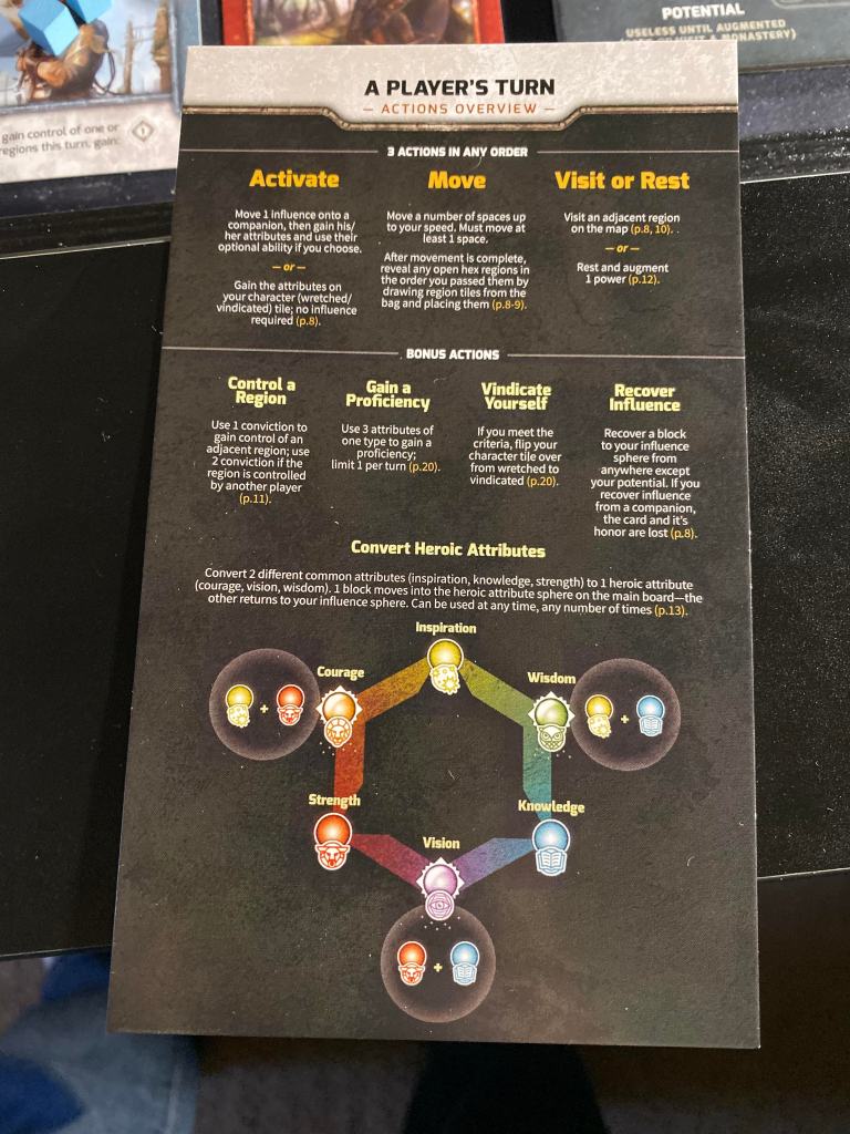 The last of the main actions is to either Visit a Location or Rest. Remember all those locations you have been drawing from the bag? Well now you have a whole plethora of actions that can potentially be taken based on your adjacency to these locations. I’m talking fighting monsters, gaining more companions, gaining more influence, gaining traits, gaining relics, increase your movement speed, remove influence from your companions and so many more. Luckily each tile has the action associated with it printed on the tile as iconography and even more lucky is that the iconography is easily learned. You can also Rest during your turn instead of visiting a location and this is your main way of moving your cubes from the Potential section to the Influence section or Influence to Conviction. You can only move a single cube so make the most of it. Over time once you have moved ALL the cubes from Potential and have over 25 Honor (Victory Points), then you can flip your player card from the “Wretched” side to the “Vindicated” side which not only gives you more Honor but also increased the Influence gain from activating your character.