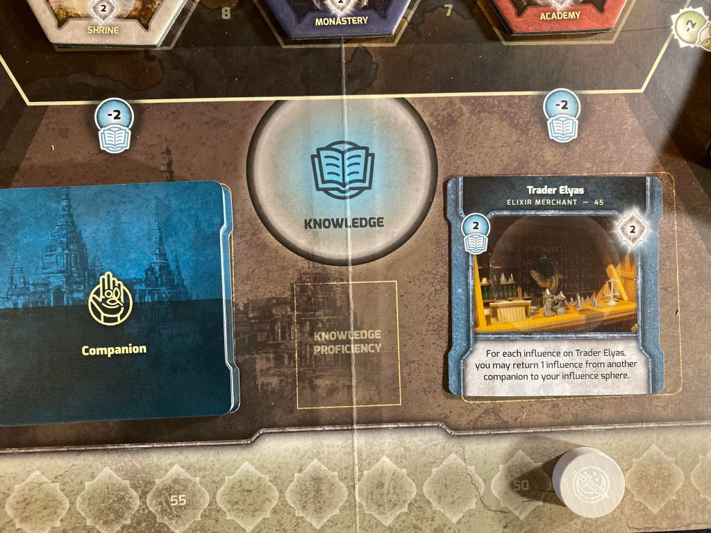 Another side action Is to gain a Proficiency tile. You can only do this once a turn but if you ever spend three influence cubes from a single attribute spot then you can gain a proficiency tile from that attribute. These tiles act as extra points towards winning the exclusive “Mastery tiles” at the end of the game for extra points. You can also discard these tiles from the game to gain two influence of the matching color any time BUT you then forfeit the tile to count towards the mastery tile at the end.