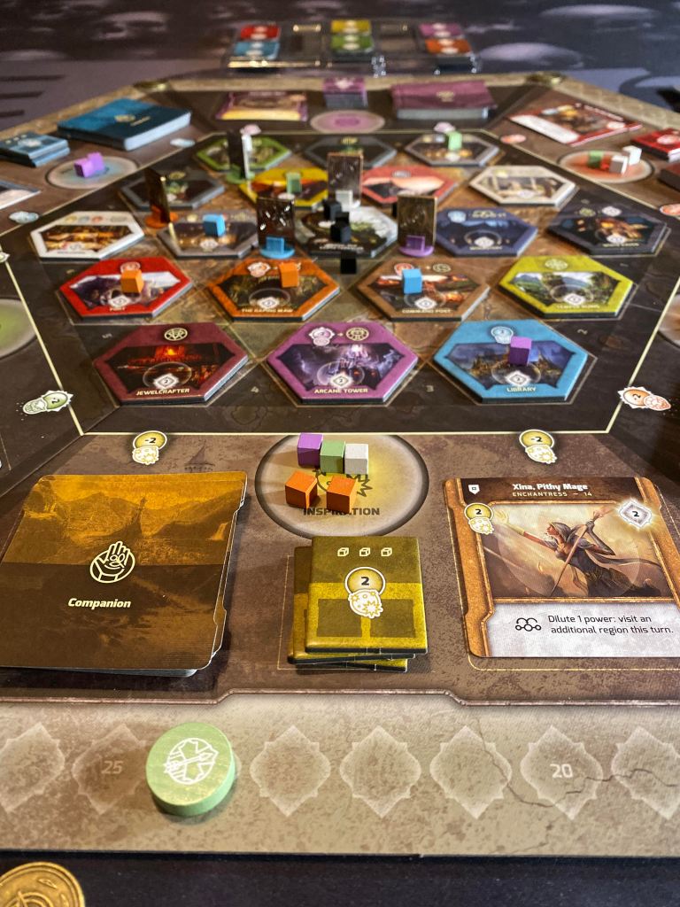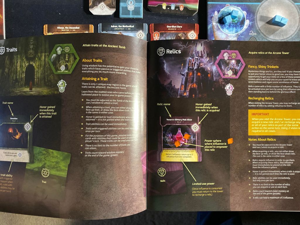 The art work is excellent throughout and I mean the theme just shines through with the gameplay. I love how your personal board has your “potential” locked away, unusable until you rest and come to realize what you are capable of and the same for conviction. I love how you use your “influence” to gain stuff from the board like companions. It’s just so cool thinking about it now, for example to gain a relic card you will need to find the Arcane Tower location tile and visit it. Once there you will have to spend two of your influence in “Vision” which is a combo of Strength and Knowledge. Overall, I am SUPER impressed with the theme and art work and can see where the game gets its name from now.