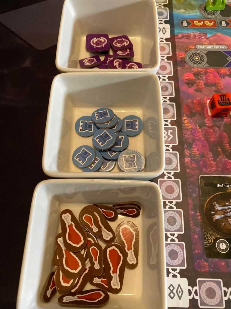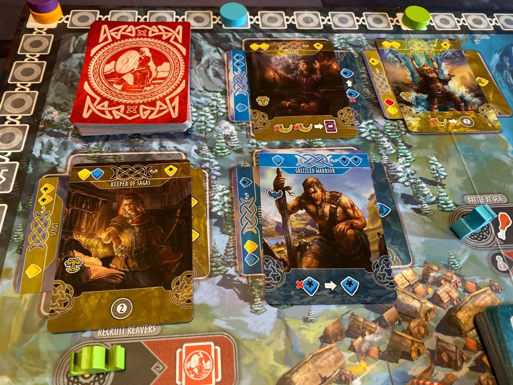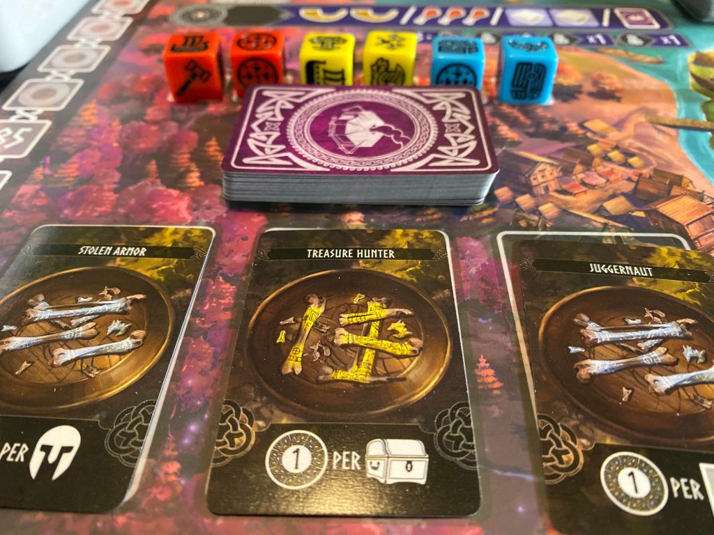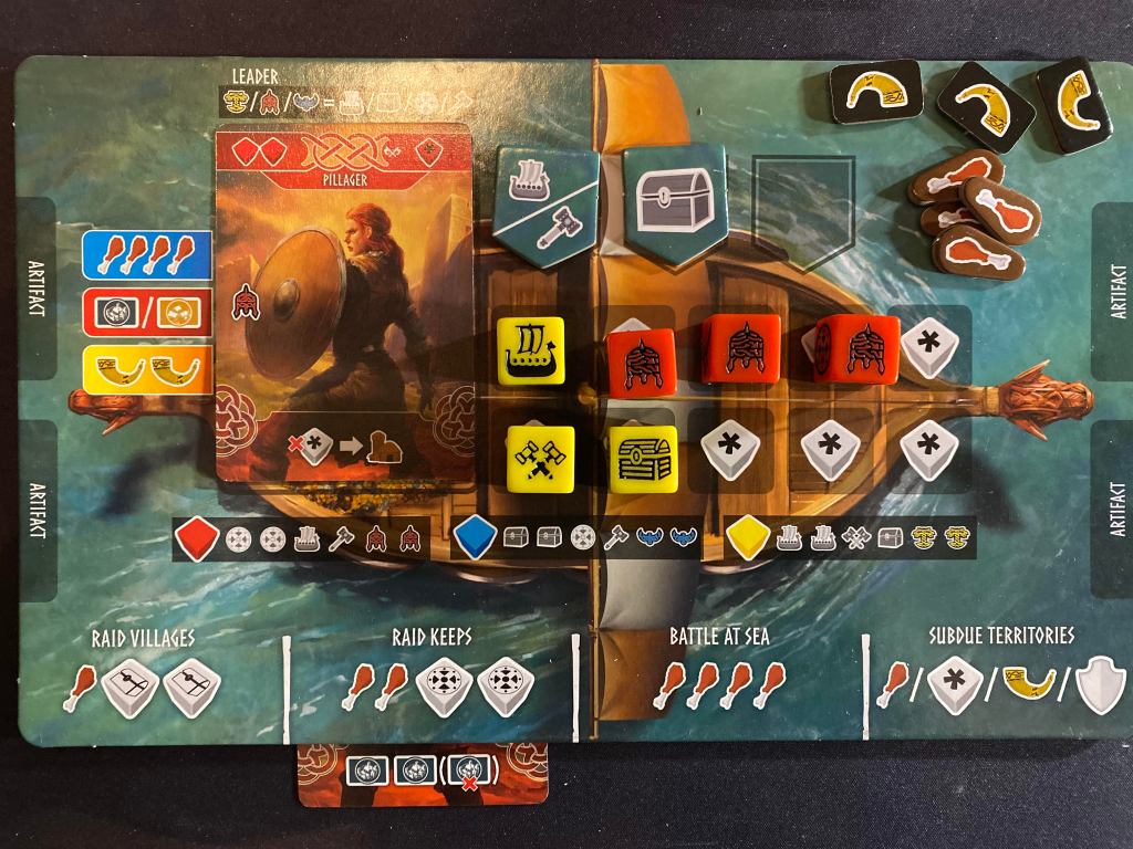 I think they did a really good job integrating the theme with the gameplay here. I mentioned it earlier but your player board is your ship which can be upgraded to more easily handle ship battles. It holds your leader Viking card on the ship itself which is neat and all the other Viking cards you acquire go under the edge of the ship to kinda show that they are also passengers. There are also interesting choices to make within the game that adds to this. For example when you “Raid Villages” you get to pick a combo of two cards with glorious items aplenty. BUT on some of those cards there are extra choices of stuff to take accompanying a negative thing. So, you could JUST raid the village and take what you need OR you can take that AND pillage the village acquiring even more goodies……with a cost of a terror token which is worth negative points at the end. This kinda stuff really enhances the overall theme of the game.