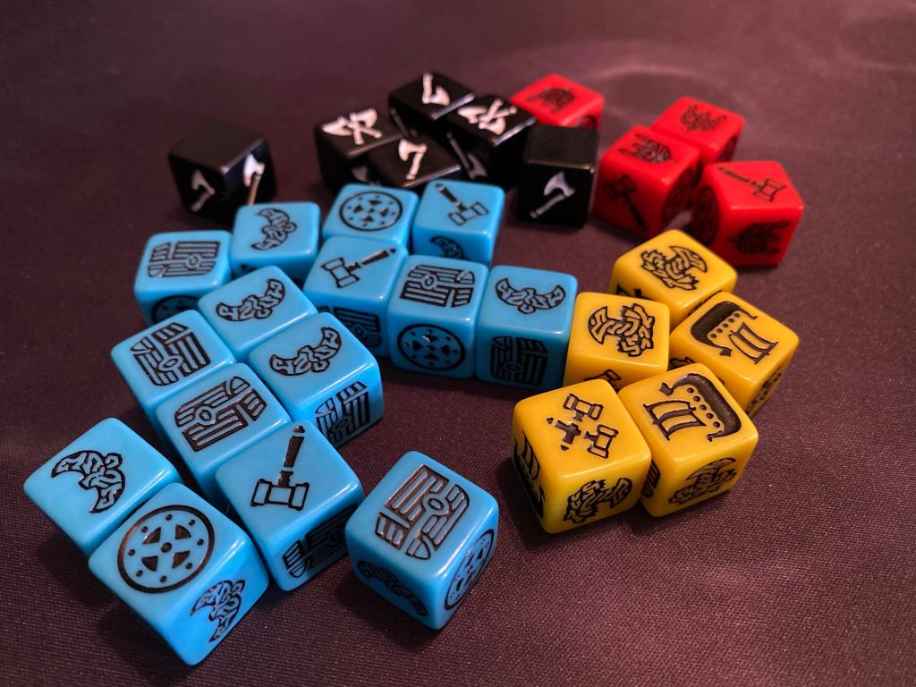 The dice, and hoooo boy are there a lot of dice, are REALLY nice. There are bookoos of blue, red and yellow dice all with nice unique emblems etched into the sides and a few black battle dice as well. They have a nice weight to them and look very vivid and colorful like most everything else in the game. The cards have a nice premium feel to them as well and have the standard card size as well as the mini size. The rest of the components in the retail version are pretty standard cardboard pieces and nothing to crow over and there are quite a few of them. I do like the cool little wooden ship meeples player’s use for their placement pieces. Aside from the dice those are my fav pieces in the game. Oh, one other thing that kinda bugged me was the Glory point tracker tokens for each player. They are just basic little round pegs, would have been super nice to at least print “100” on one side of each of them to notate when a player surpasses that illustrious 100 point spot on the track. Just a small touch but would have made a world of difference.