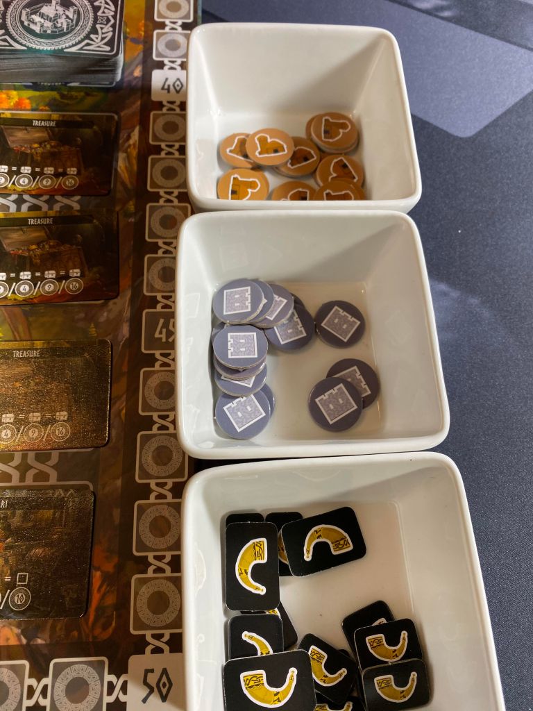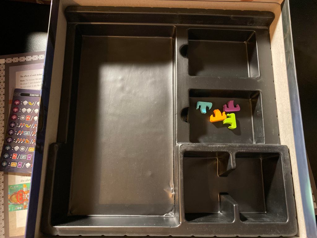 There is a plastic insert with the game but mehhhhhh. I always enjoy a good insert but this one just squeals meh to me. There are spots to hold the cards which is always welcome so I don’t have to bag them up BUT there is just one other big gap for everything else so you HAVE to bag all the tokens up. And you will want to bag the tokens up individually unless you just want a giant pile of various tokens to scrounge through every time you play. No good spots to store the dice either so those will all have to be bagged up. And even after you bag up everything there is a specific spot to put the player boards but the amount of tokens that are bagged bulges those up a bit so the board that sits on top of that doesn’t sit even.