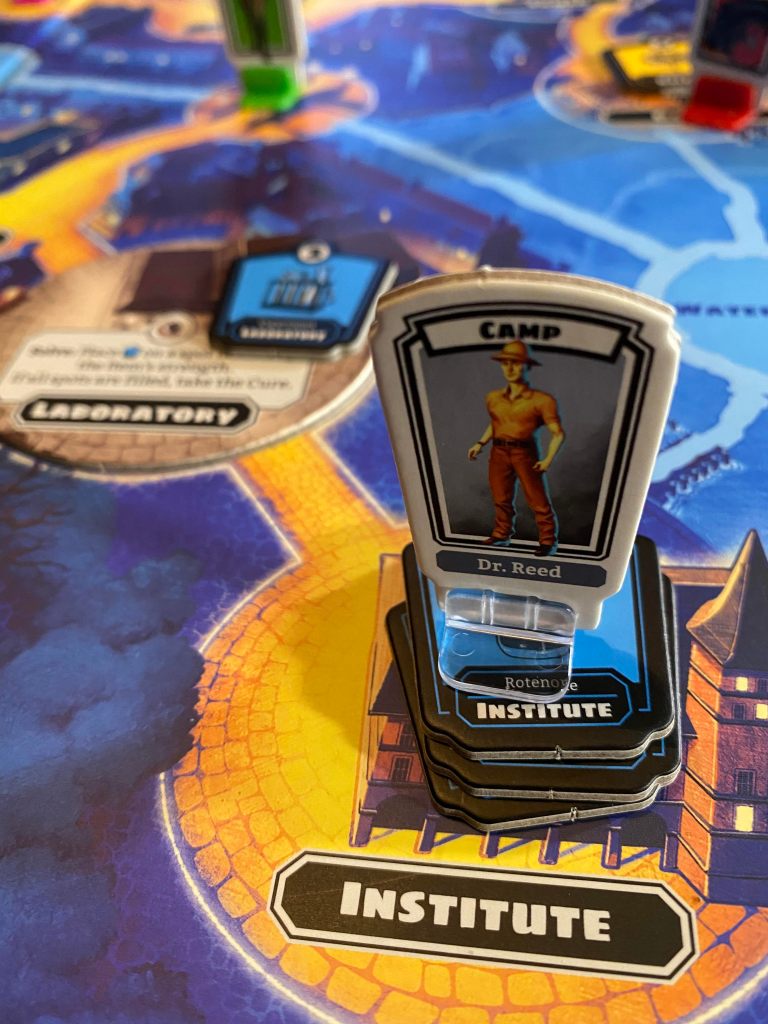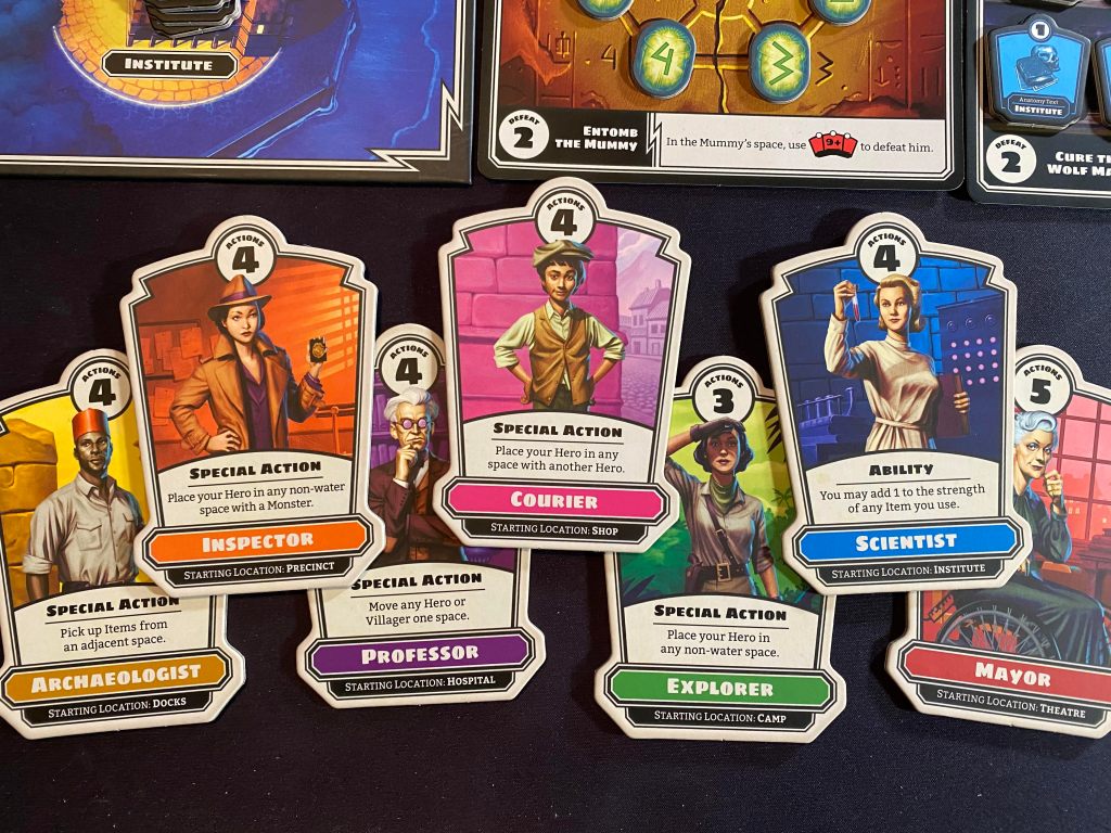 As far as replayability goes, this game is quite high in that department. I mean there are 6 COMPLETELY different monsters (Frankenstein and his Bride work together) to choose from and you can mix and match them to create different strategic situations. You can add more monsters to make the game more difficult or remove some to make it easier. Each of the playable characters is slightly different as well ranging from having different abilities to how many actions they get in a turn. That said, the explorer is very powerful and even though she only has 3 actions, her special ability allows her to basically teleport to any non-water space on the board. So, if you find a particular group of monsters a bit too hard try giving her a shot!