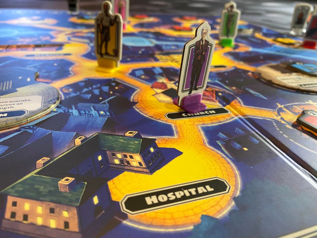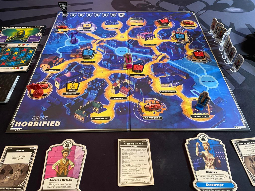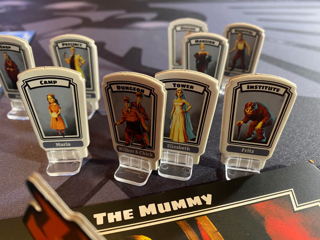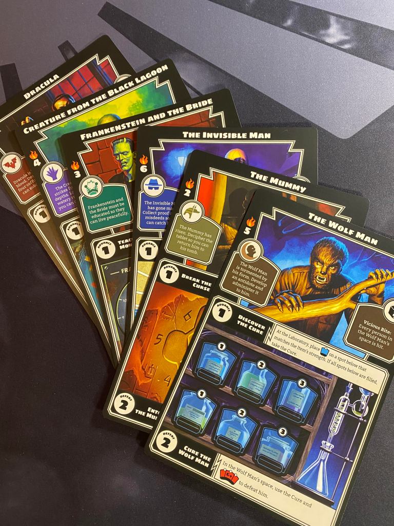 In Horrified you and up to five players will be working together to thwart the evil machinations of a variety of Universal’s Monsters. The game setup varies a bit depending on which monsters you choose to go against, and how many! A beginner’s game (as stated in the rulebook) is to go against Dracula and The Creature from the Black Lagoon at the same time but you could mix and match any of the six monsters or if you find that too easy then you can add more monsters to the mix. Each monster has a completely unique way to defeat it so finding that balance of enjoyment is entirely up to the player.