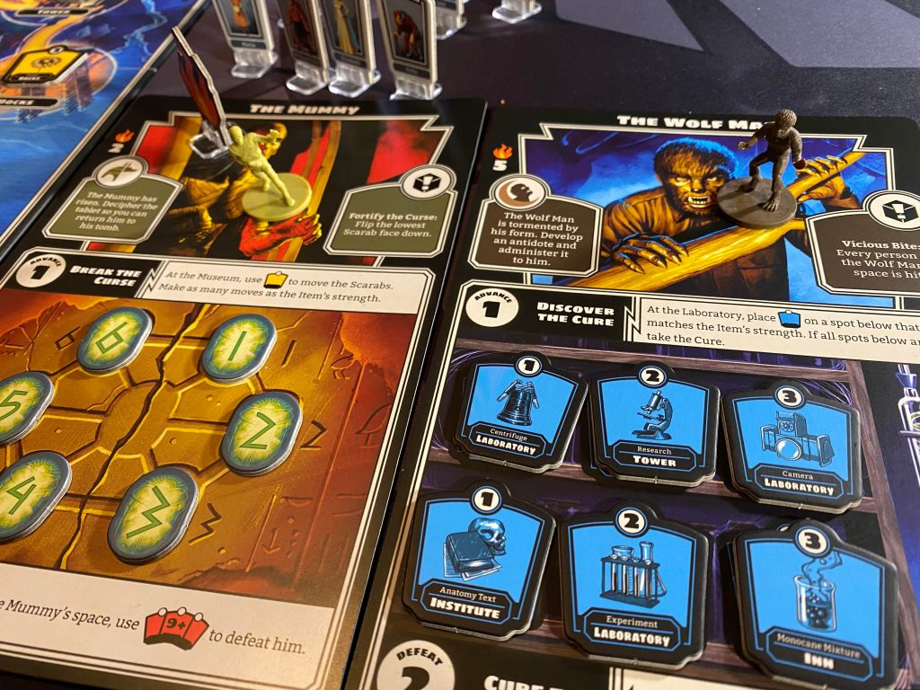 Speaking of nice touches, there are an abundance of them with this game. Apart from the monster minis, the monster setup cards are just awesome. Each one details how to defeat that specific monster and has unique tokens that interact with its card in some way. For example, the Mummy card has six scarab tokens that are numbered and mixed up. You are to get to the museum space on the board and, using items that you have picked up, move those tokens around until you line up the correct number combination. The Wolfman has a vial token on his card that sits under those line squiggly tubes. Players are to go to the laboratory and add certain item tokens to his card which act as specific ingredients to create a cure! After all the ingredients have been added, the player gets to collect the vial to try and administer it to the Wolfman.